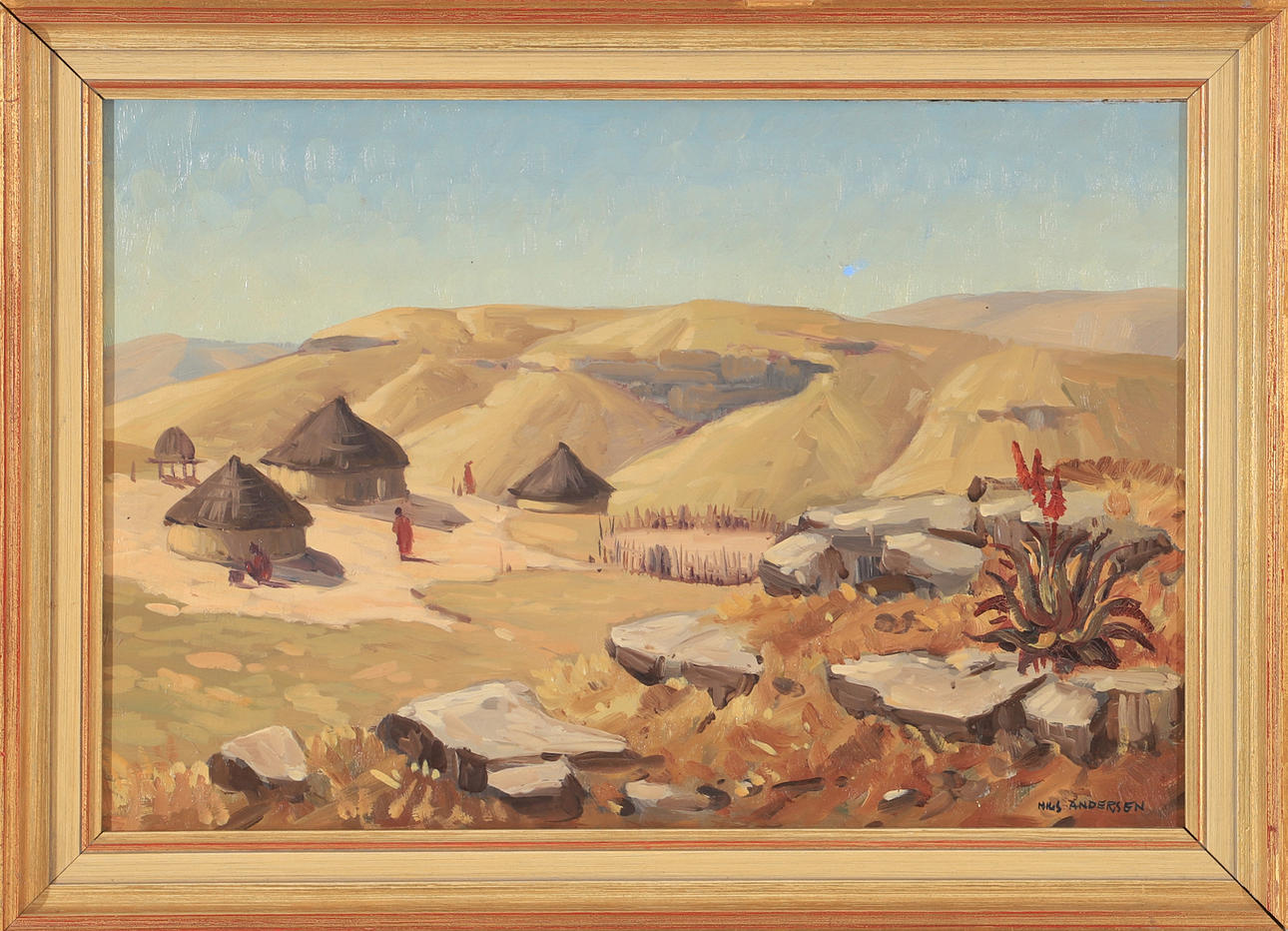 NILS ANDERSEN. Landscape with huts, oil on Board, signed.