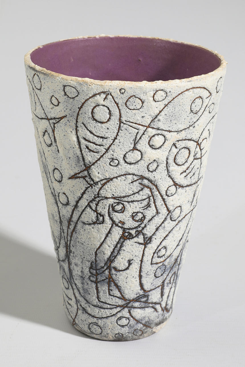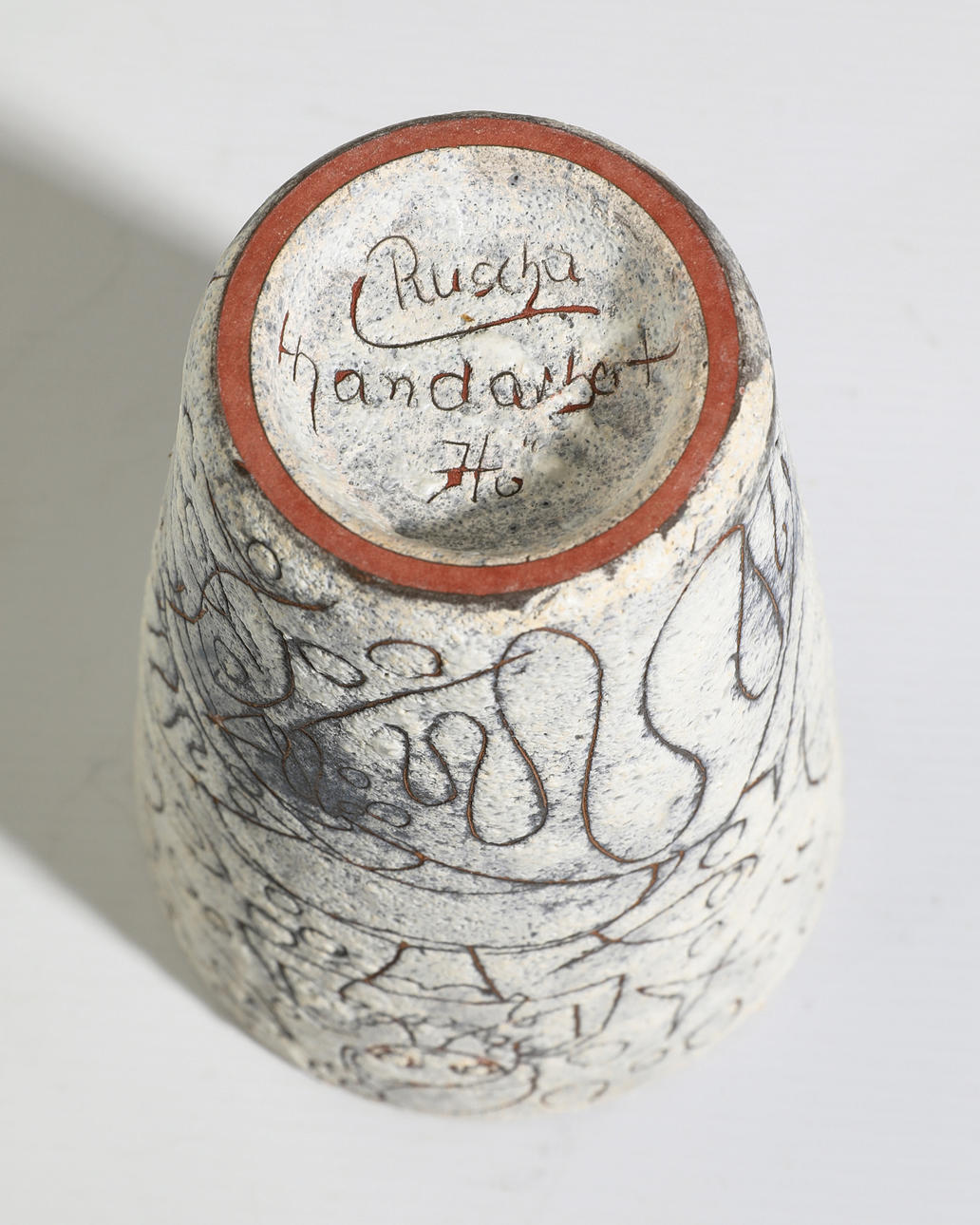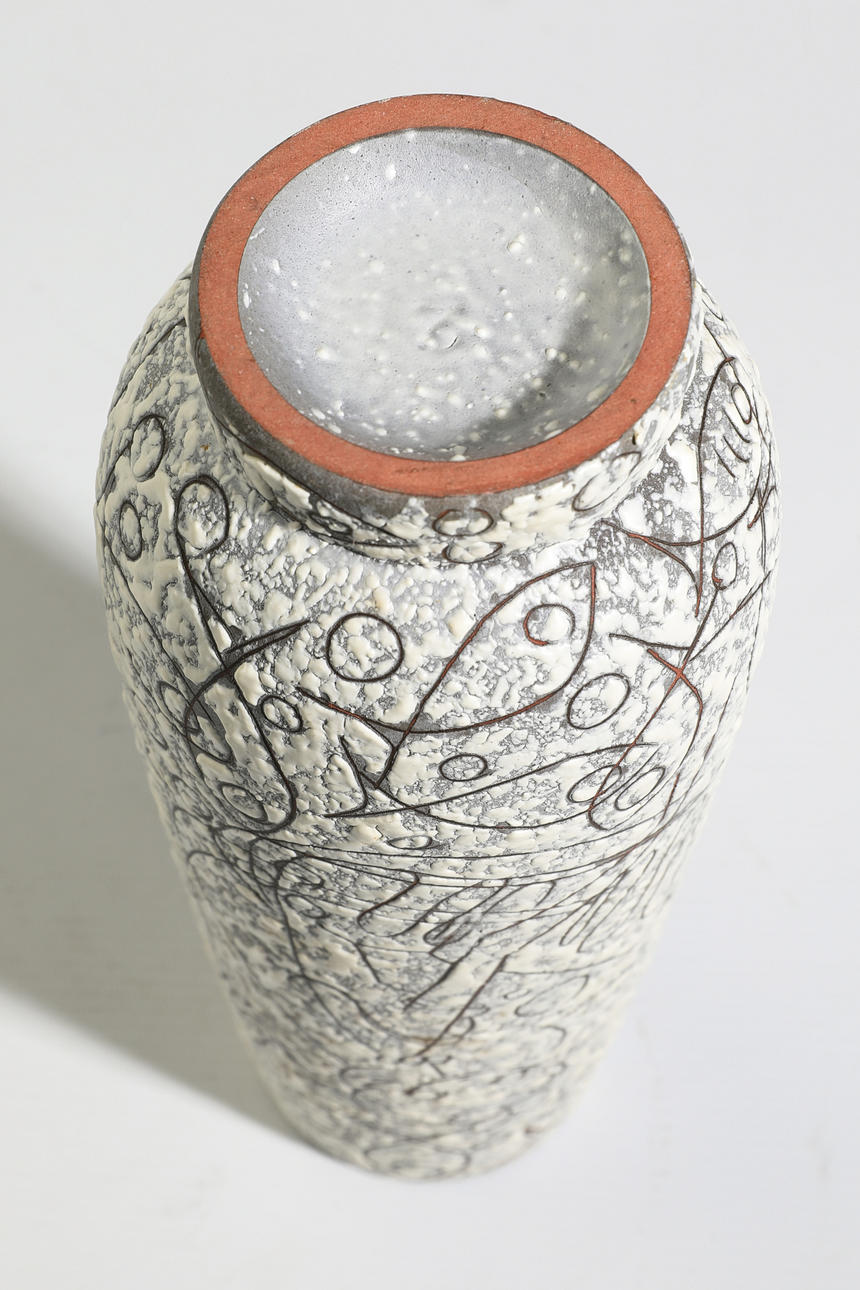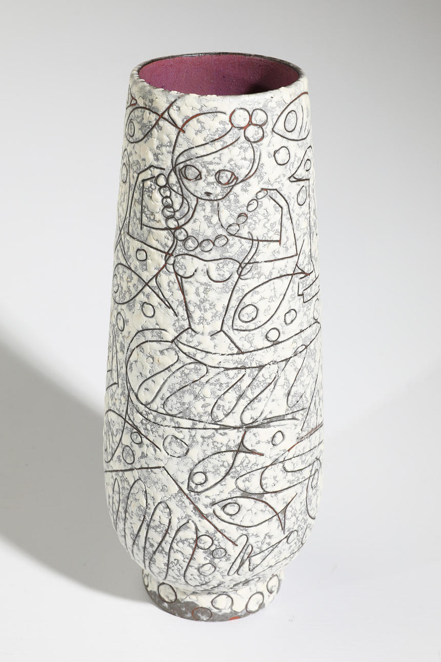 4 vases. 1960s. pottery. Structured foamy wavy glaze, engraved decorations 'filigree' with female figures, fish and deer. Interior glazed in lilac. h. 27.5 cm; 23.5cm; 17.8cm; 16.5 cm. Conical vase marked on the bottom; Ruscha handmade HÖ (scratched). Vase with handle on the bottom with form number: 312 (raised).