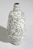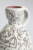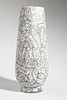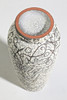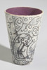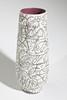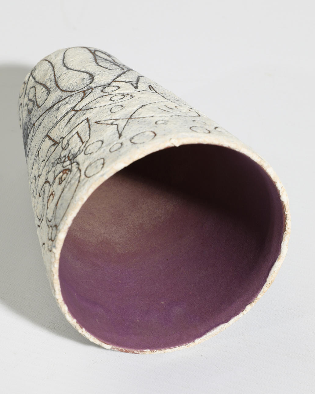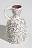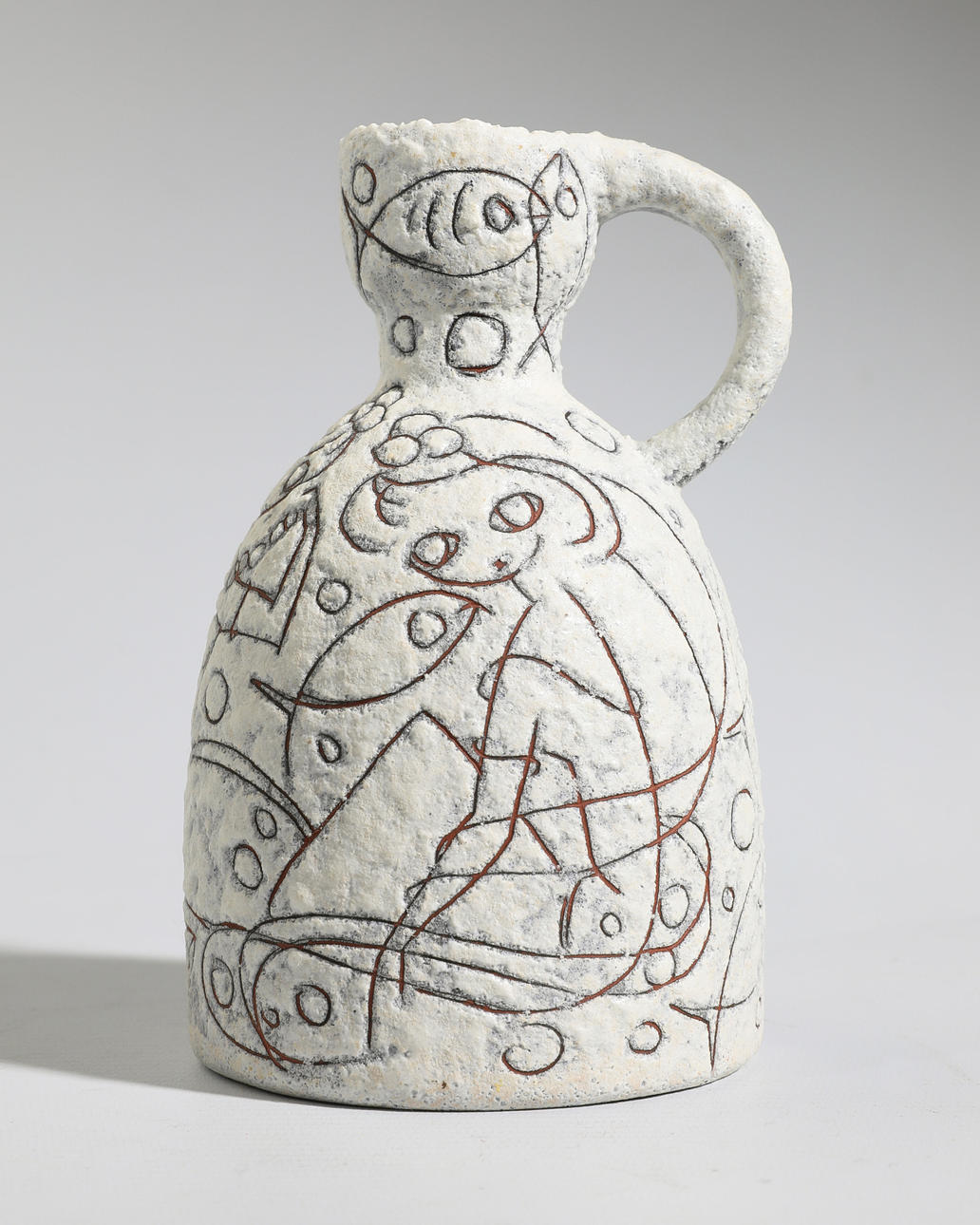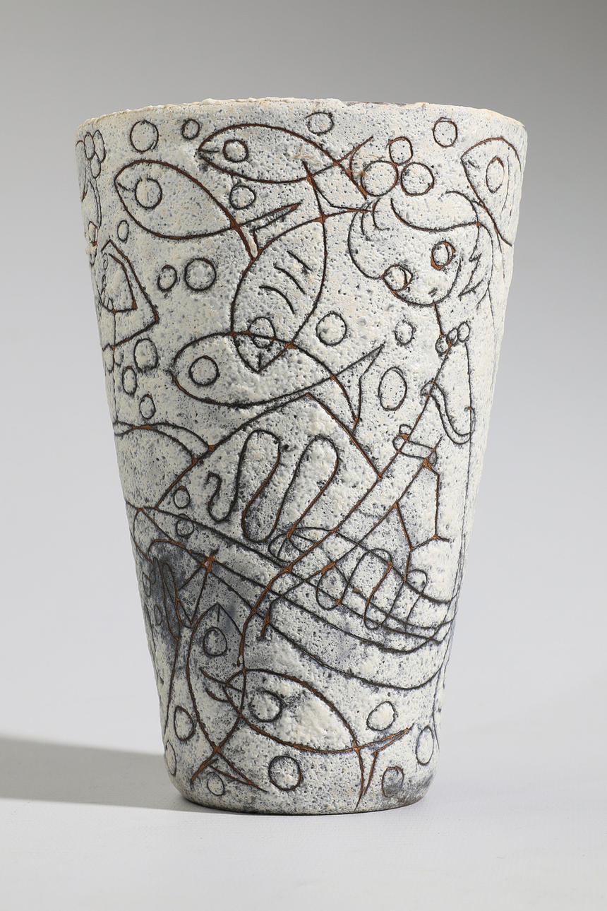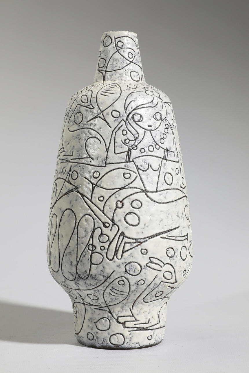 4 vases. 1960s. pottery. Structured foamy wavy glaze, engraved decorations 'filigree' with female figures, fish and deer. Interior glazed in lilac. h. 27.5 cm; 23.5cm; 17.8cm; 16.5 cm. Conical vase marked on the bottom; Ruscha handmade HÖ (scratched). Vase with handle on the bottom with form number: 312 (raised).