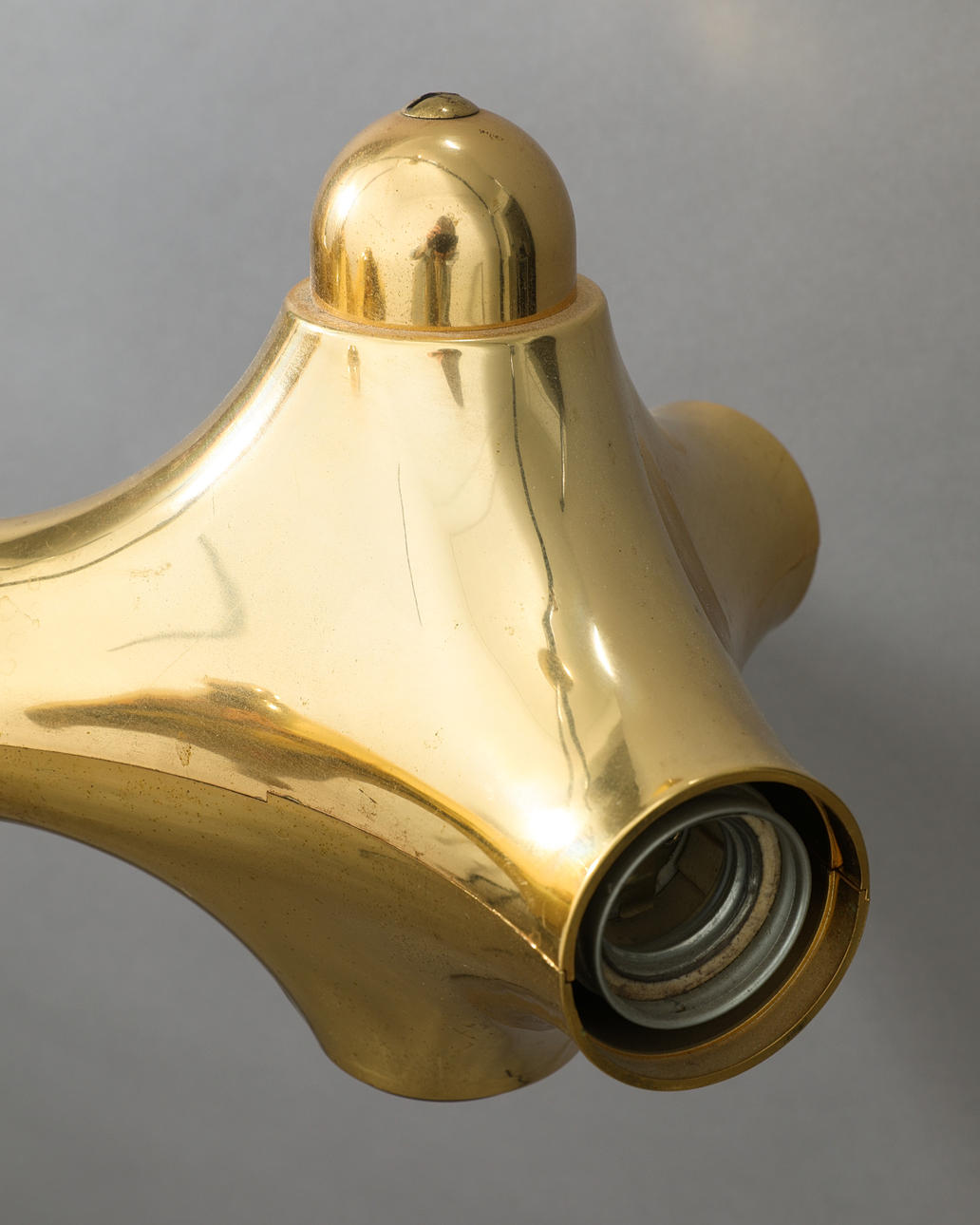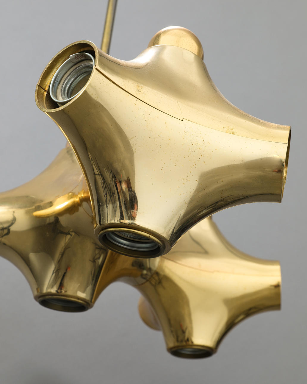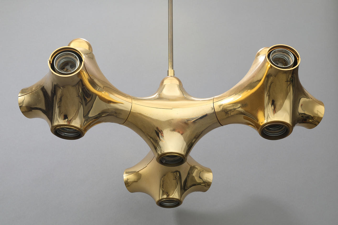 Organic Cosack pendant lamp model Gemini. Draft 1960s. Gold-colored plastic, brass, equipped with 10 burners. H. 70, D. 54 cm.