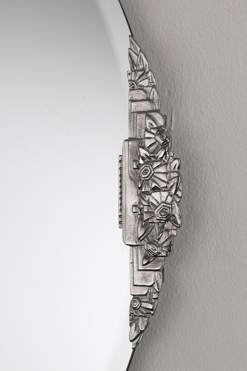 Art Deco circular wall mirror. Left and right chromed floral ornaments. D 59.5 cm.