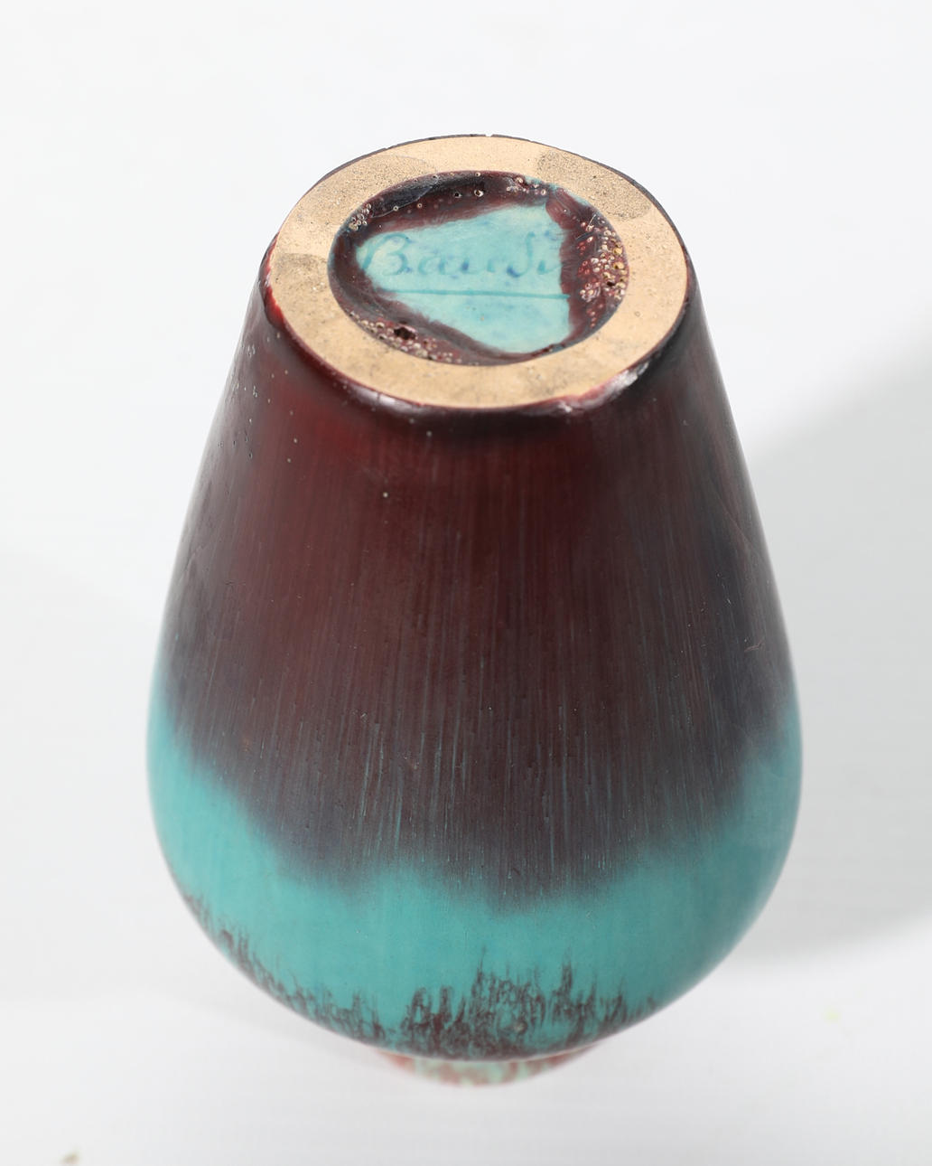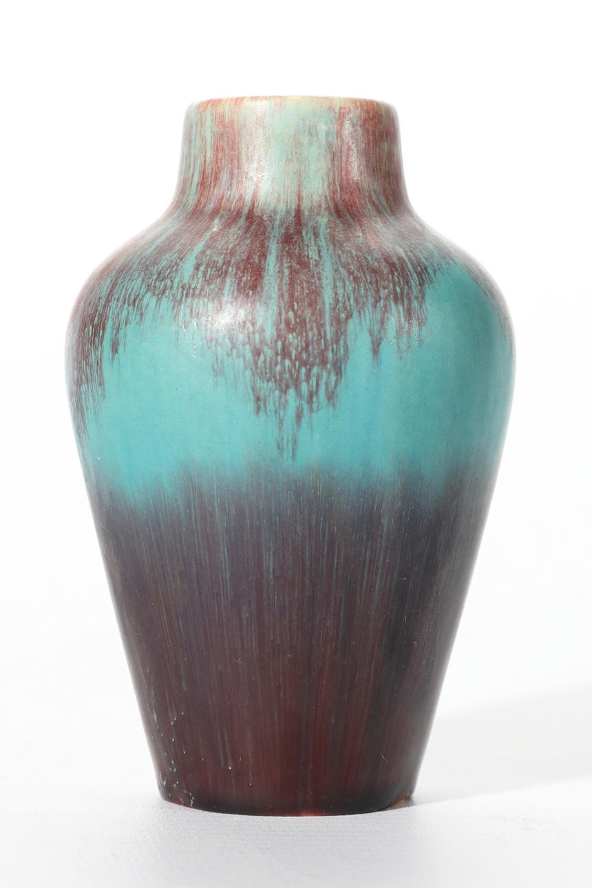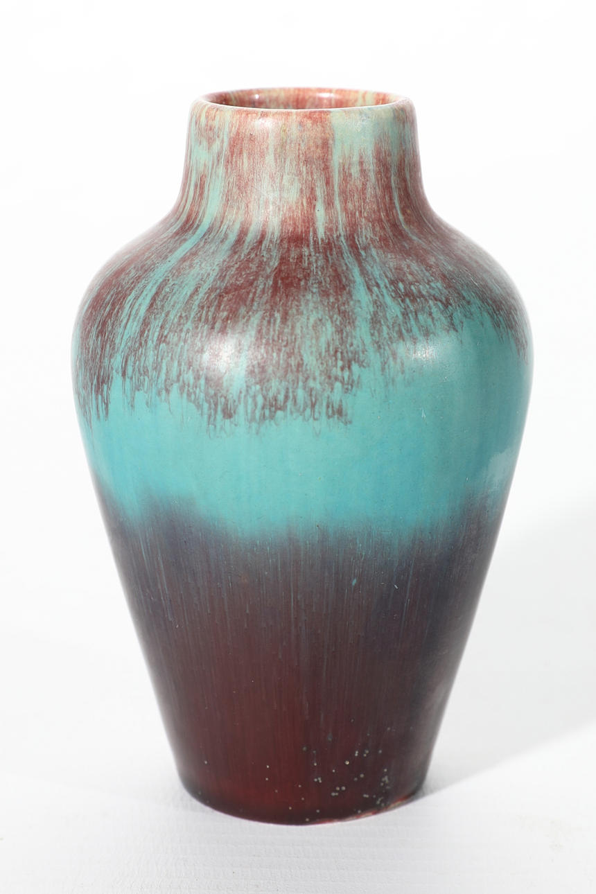 Good condition. Small oxblood turquoise colored vase with minimal glaze wear on the bottom edge and extremely minimal glaze chip on the bottom edge.