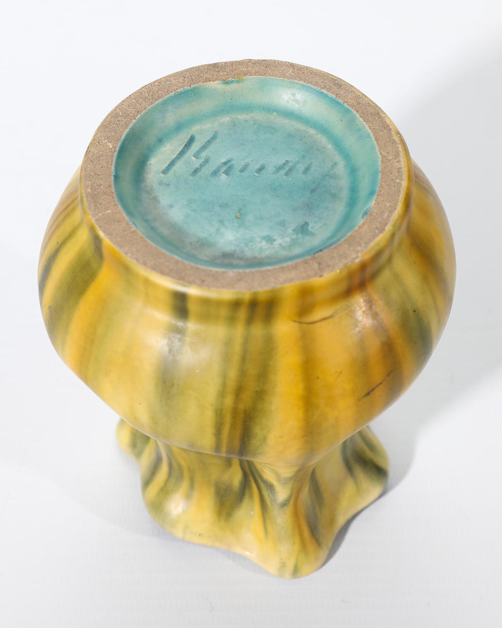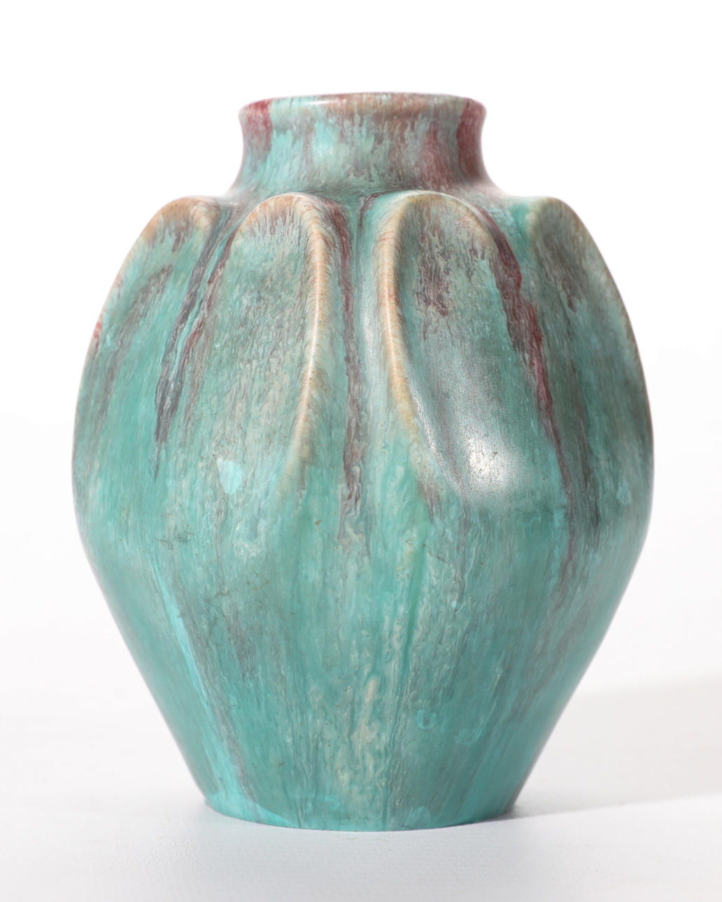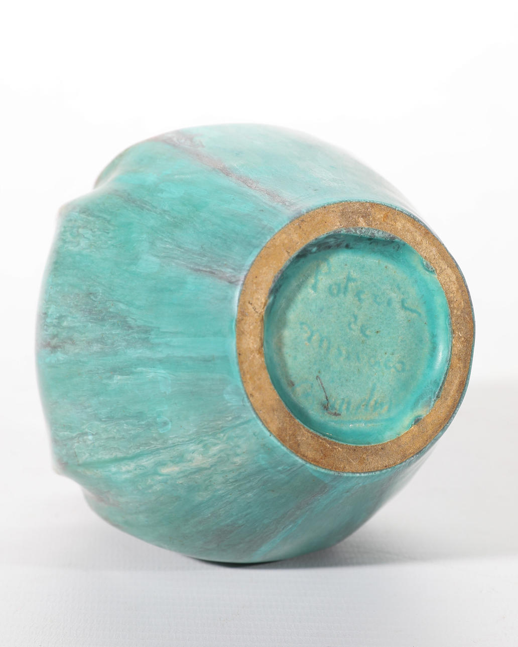 Good condition. Small oxblood turquoise colored vase with minimal glaze wear on the bottom edge and extremely minimal glaze chip on the bottom edge.
