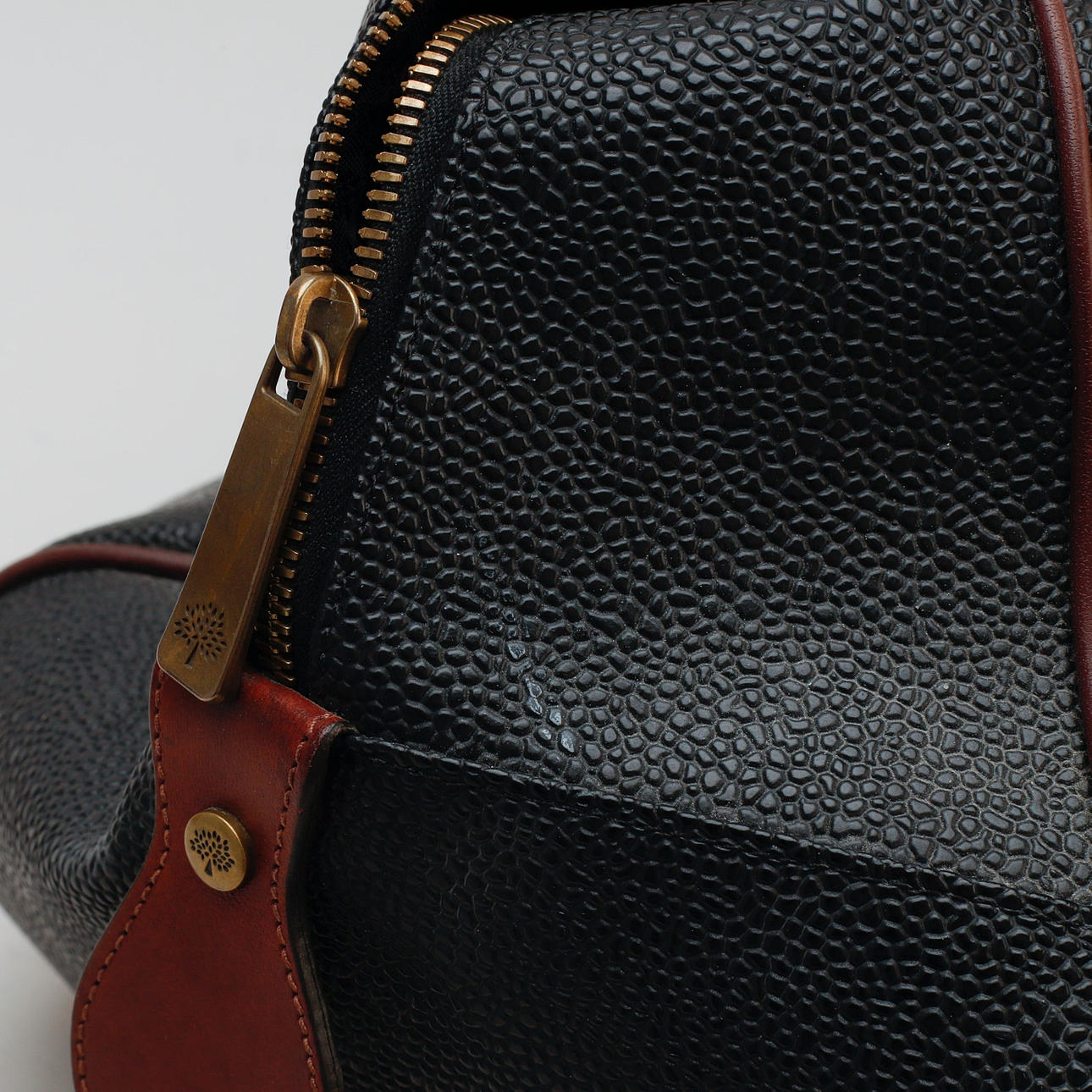 Scotchgrain with leather details. One inner pocket and one outer pocket with zipper. Rolled leather handles, Top double zipper. Lining in Mulberry black fabric.