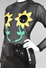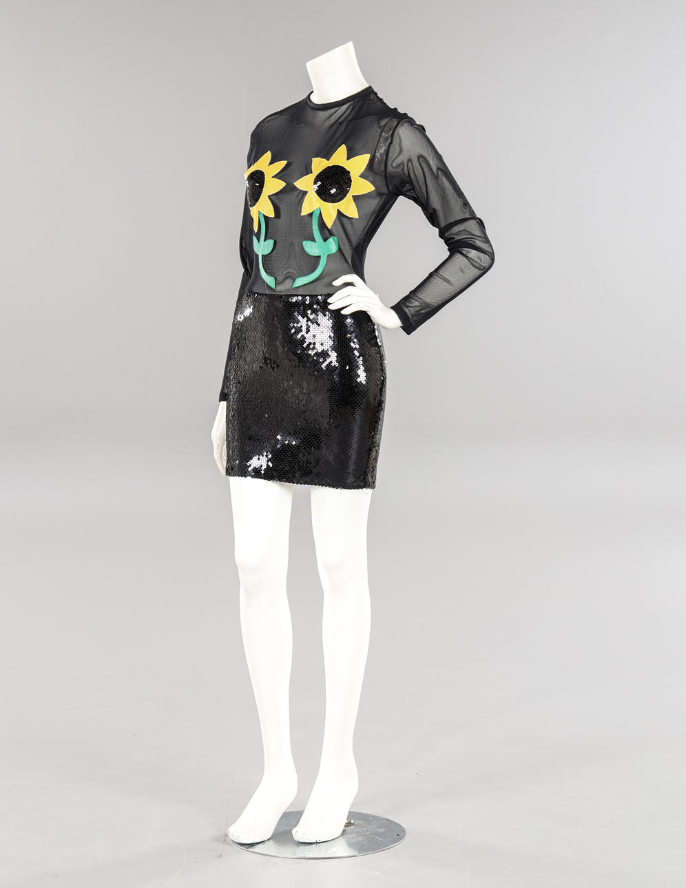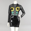 Dress with upper part in black mesh with leather applications and sequins in the shape of sunflowers. Skirt in sequins. Size M. Length approx. 83 cm. Bust width approx. 90 cm. Sleeve length approx. 60 cm.