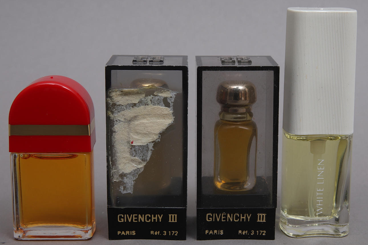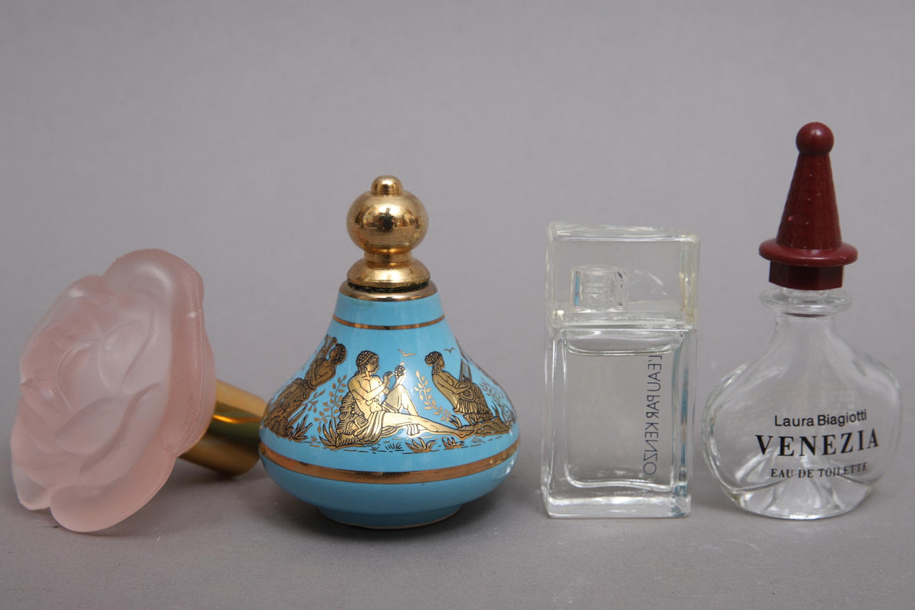 Rust-shaped bottle, porcelain bottle & Venezia are empty of contents. Other perfumes are used sparingly. Wear and tear on packaging.