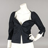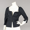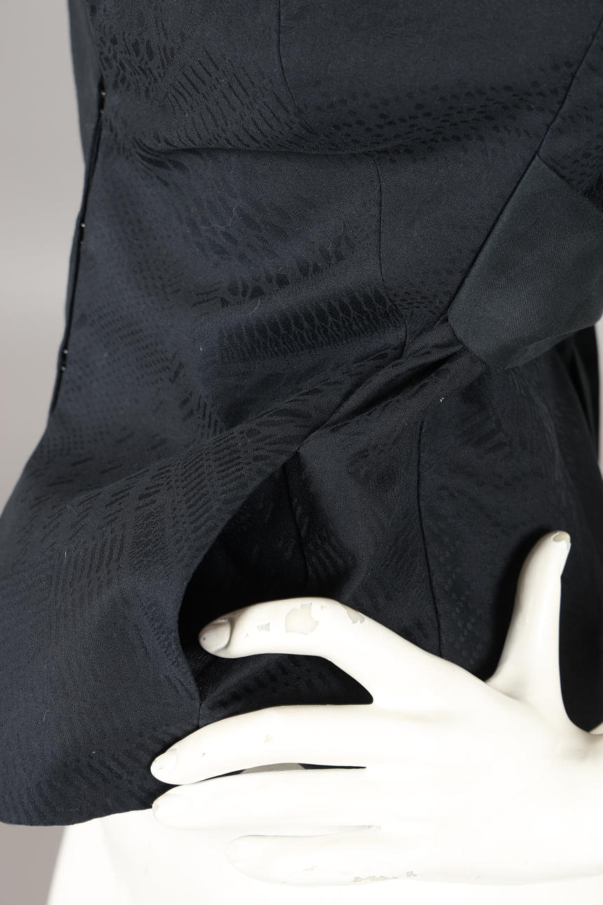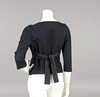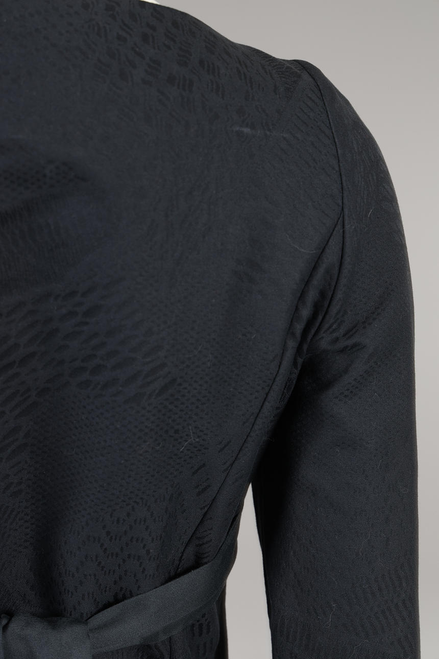 Short jacket in black pattern woven cotton. Fastens with pockets, ties at the waist, hidden pockets. Size FR 40. Back length approx. 50 cm. Bust width approx. 90 cm. Sleeve length approx. 50 cm.