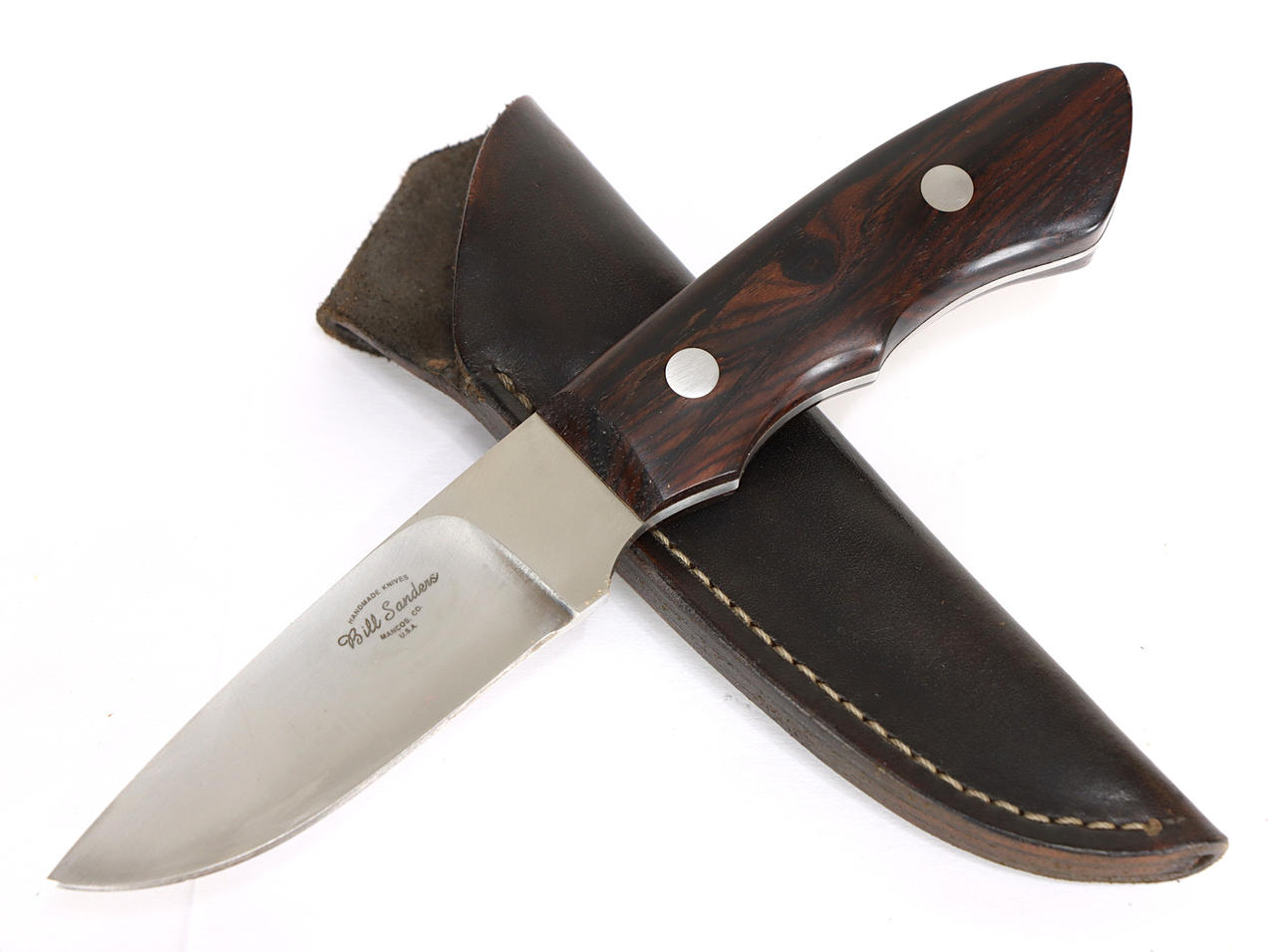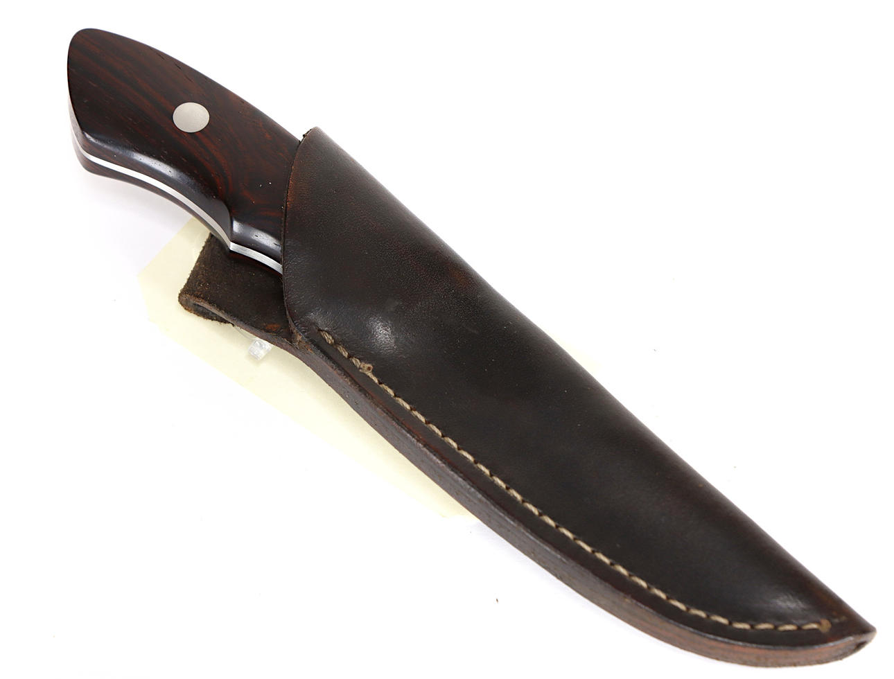 Blade length approx. 10 cm, total length approx. 20 cm, tapered full tang, wooden shaft, leather sheath.