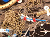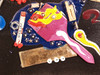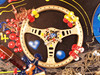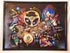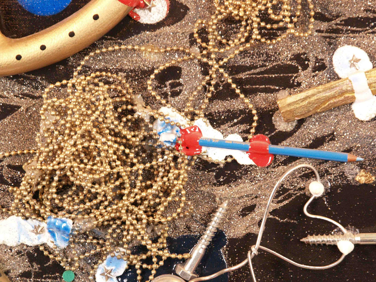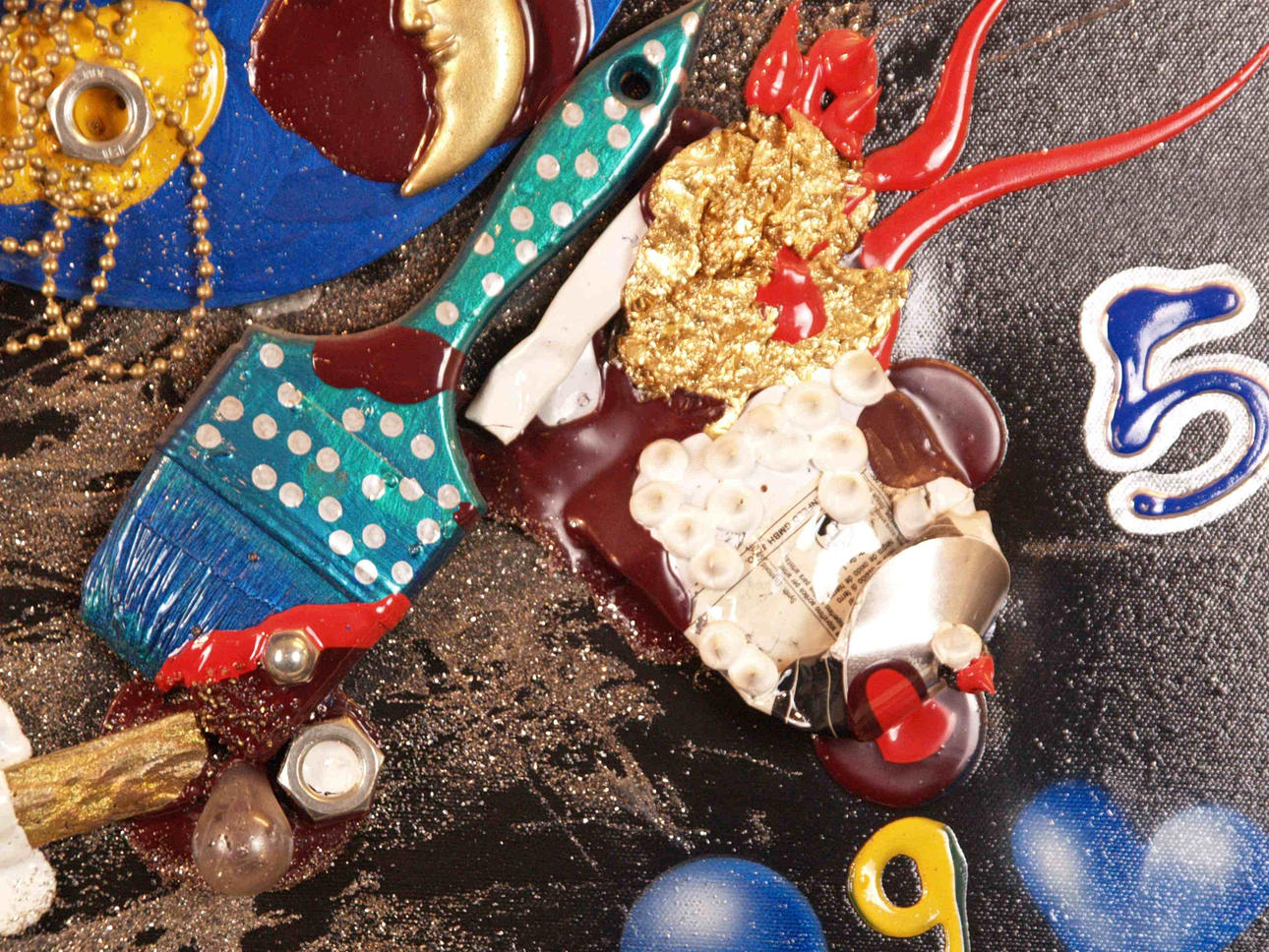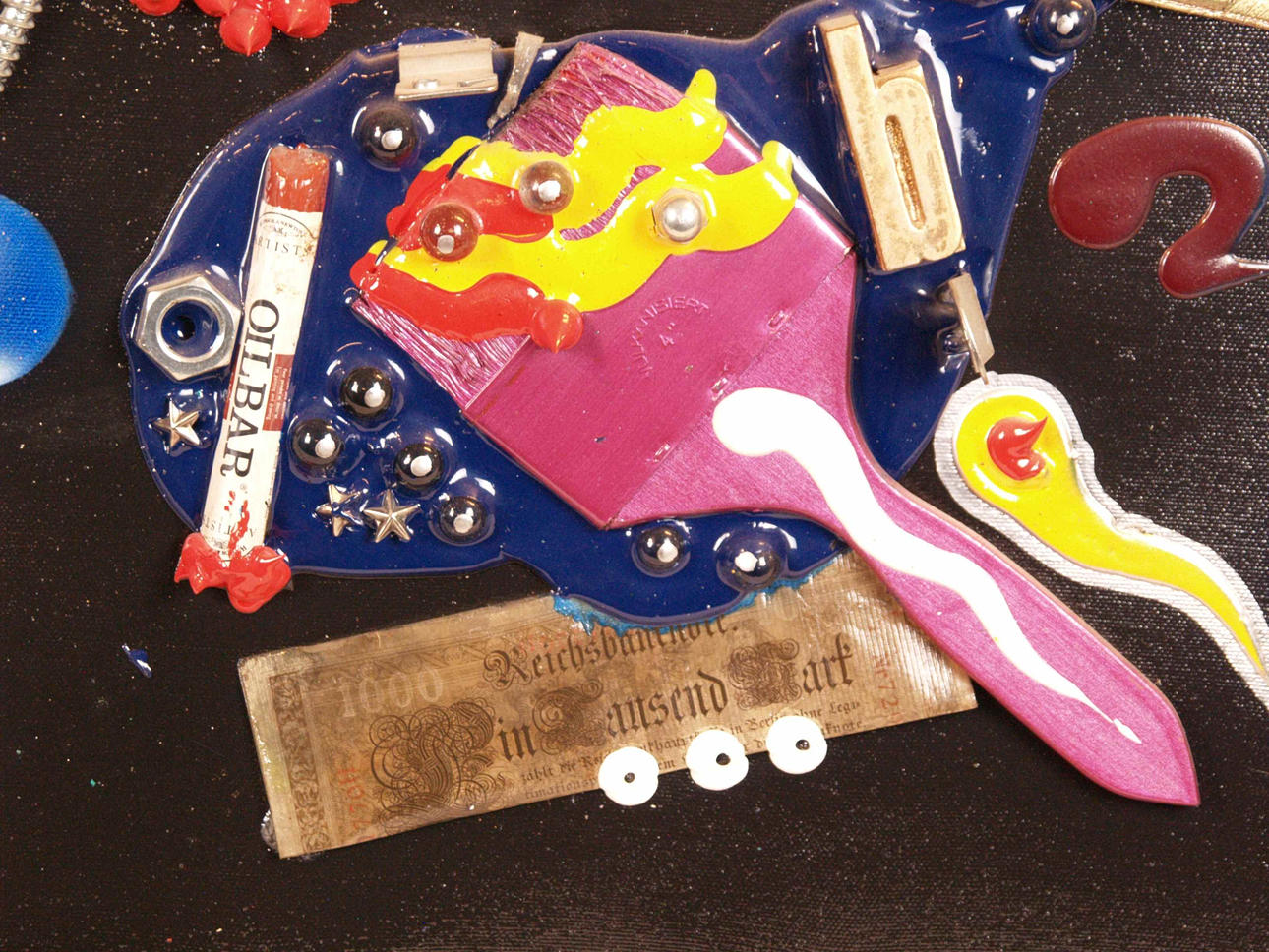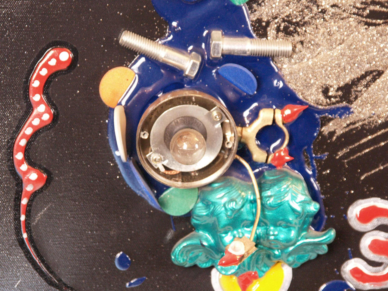 including acrylic, collage with various objects: hand tools, steering wheel, colored pencils, knight figure, WRISTWATCH etc., signed lower left, approx. 114x148 framed Micmac (Bea Schröder, contemporary artist in Düsseldorf).