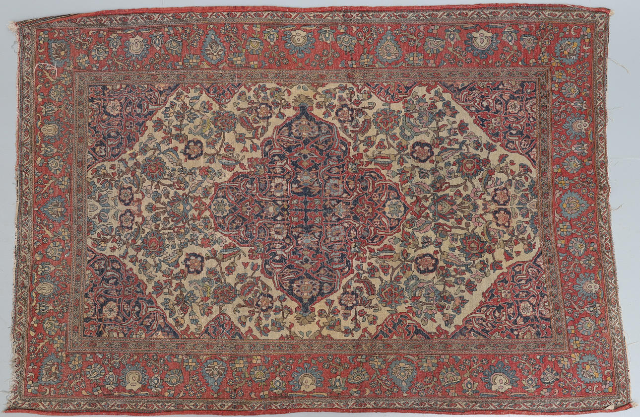 with a central floral medallion, on an ivory ground, within a red ground main border, 210cm x 140cm.