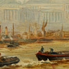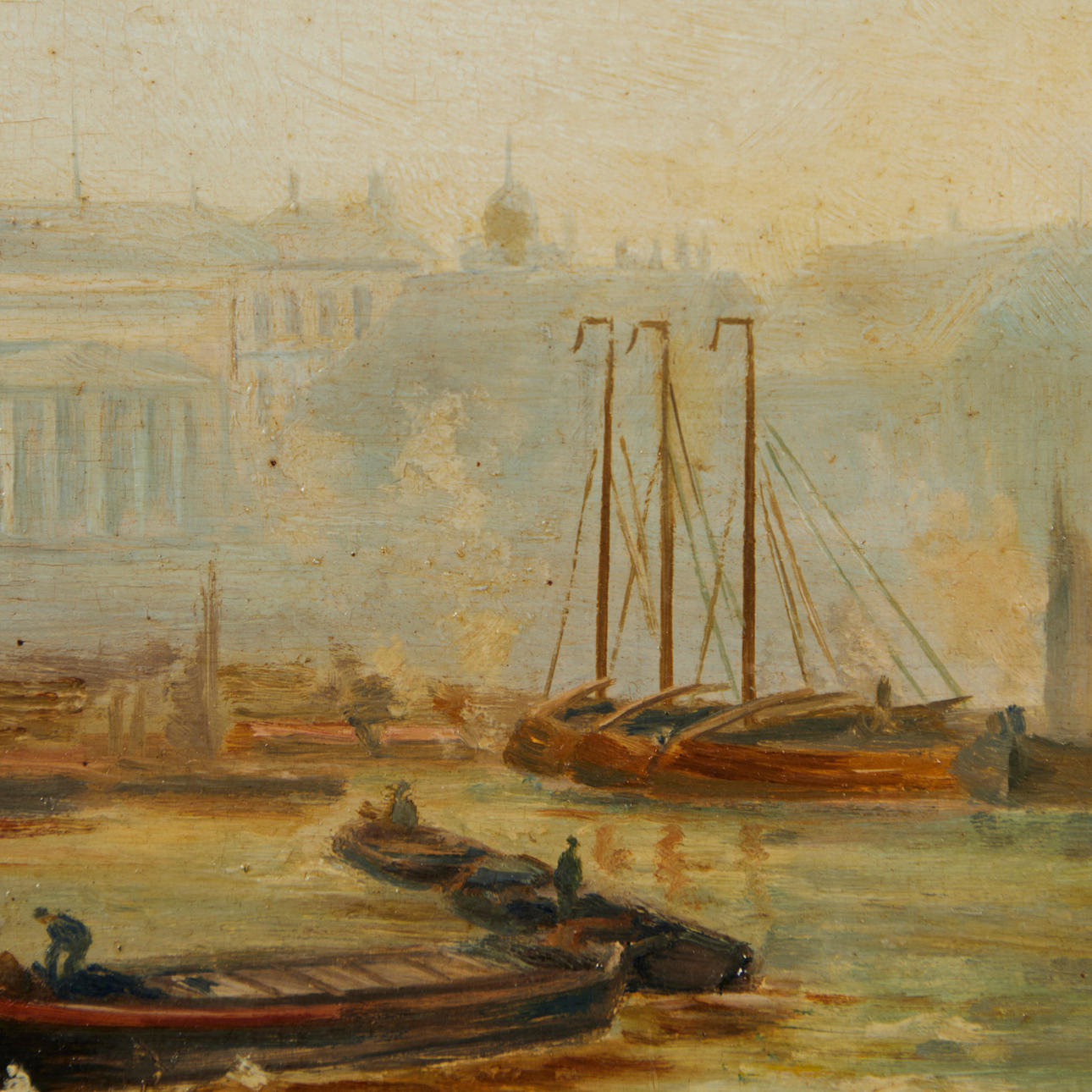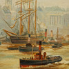 P. Jansen, painting, harbor scene, oil on panel, 1910. Depiction of a harbor populated with ships and steamboats in front of an urban landscape in the background, signed and dated lower right, 22x28.5cm (37.5x44.5cm).