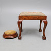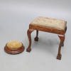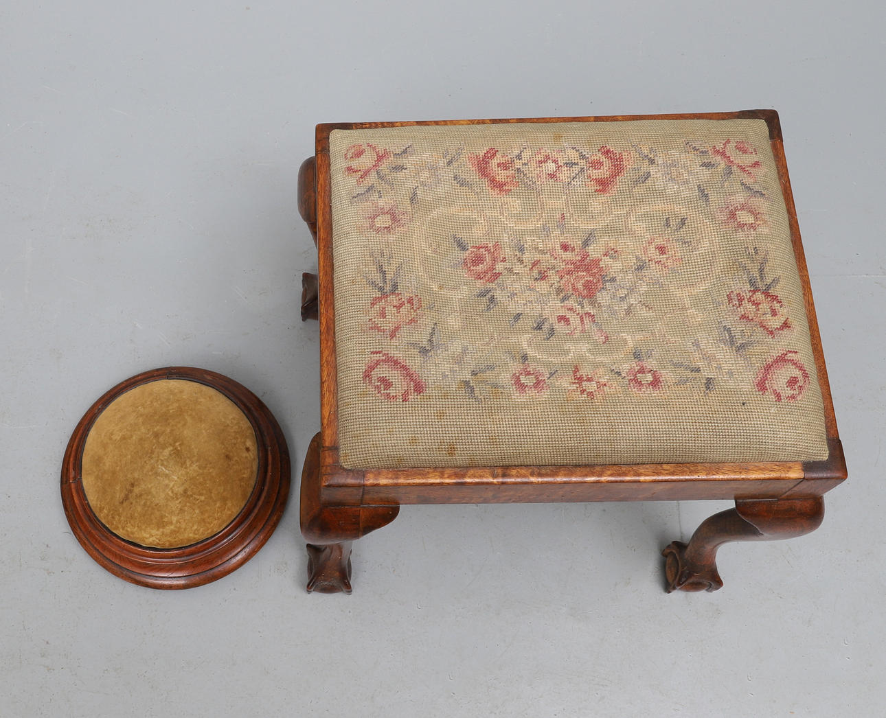 with a drop-in seat upholstered in old gold velvet, the spreading sides, on three ball feet, 29.5cm diameter x 10cm high, and a reproduction mid-18th century style rectangular mahogany dressing stool, with a drop-in floral needlework seat, on cabriole legs with claw and ball feet, 50cm wide x 43cm deep x 44cm high (2).