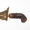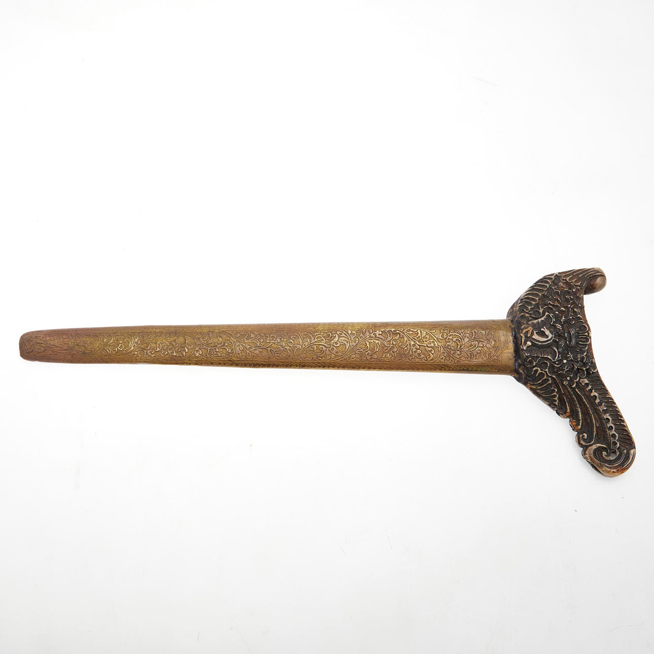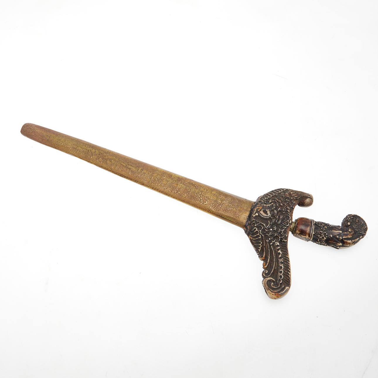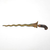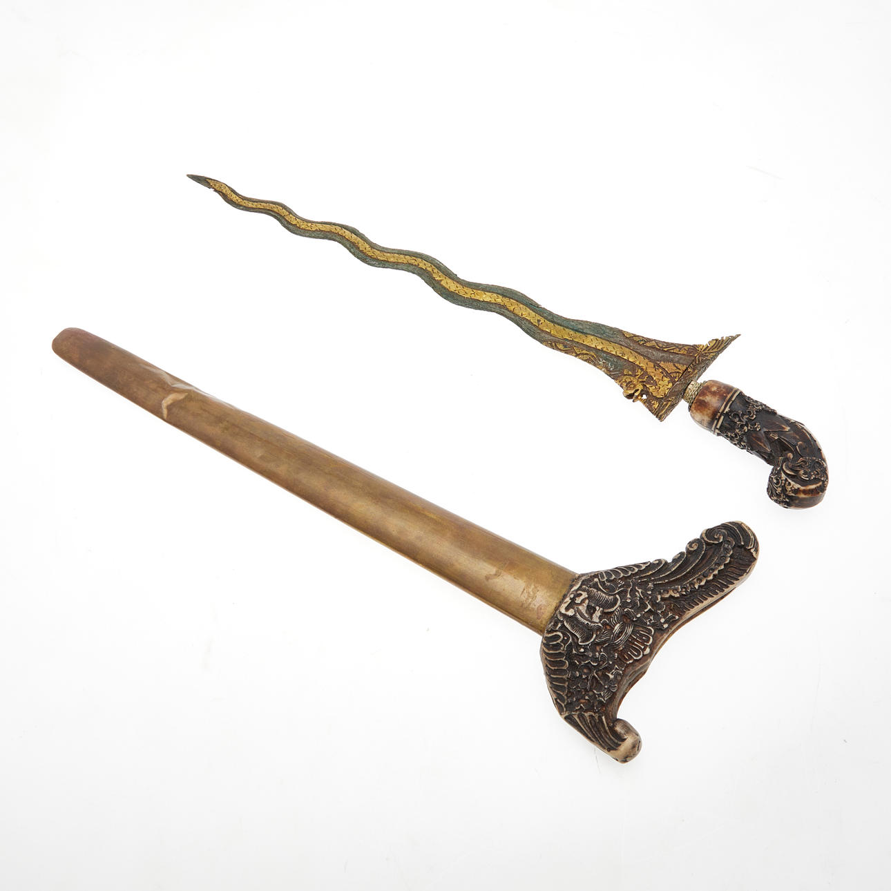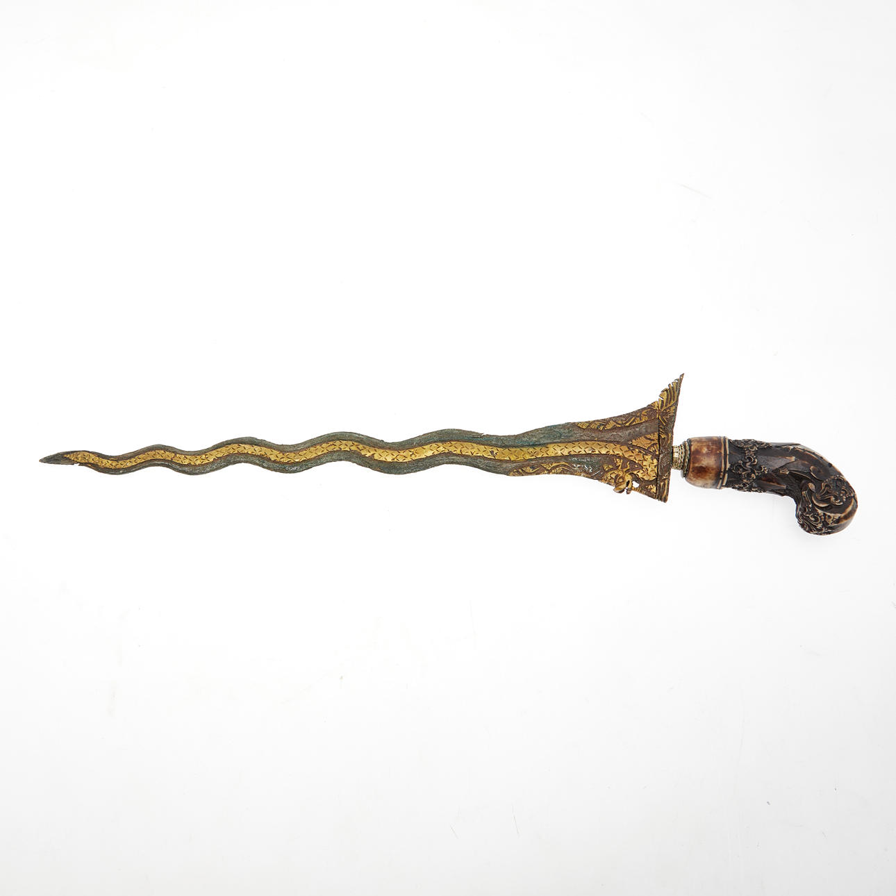Kris, Indonesia. Kris with a wavy, double-edged pamor blade with an incorporated dragon and a florally carved bone handle, brass sheet scabbard with a bone wrangka in relief on the obverse side, sharpened blade, L.44cm, blade width: 22mm.