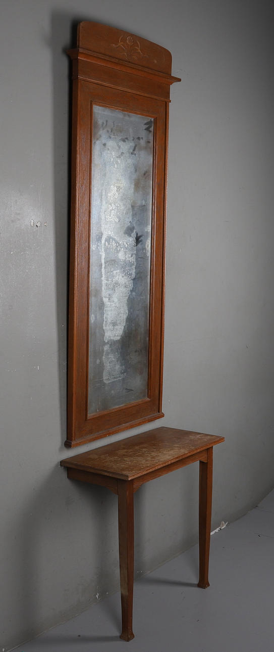 Veneered with oak. Cut decor. The mirror approx. 174 x 74 cm. Table length approx. 75, width 34, height 72 cm.