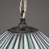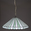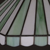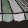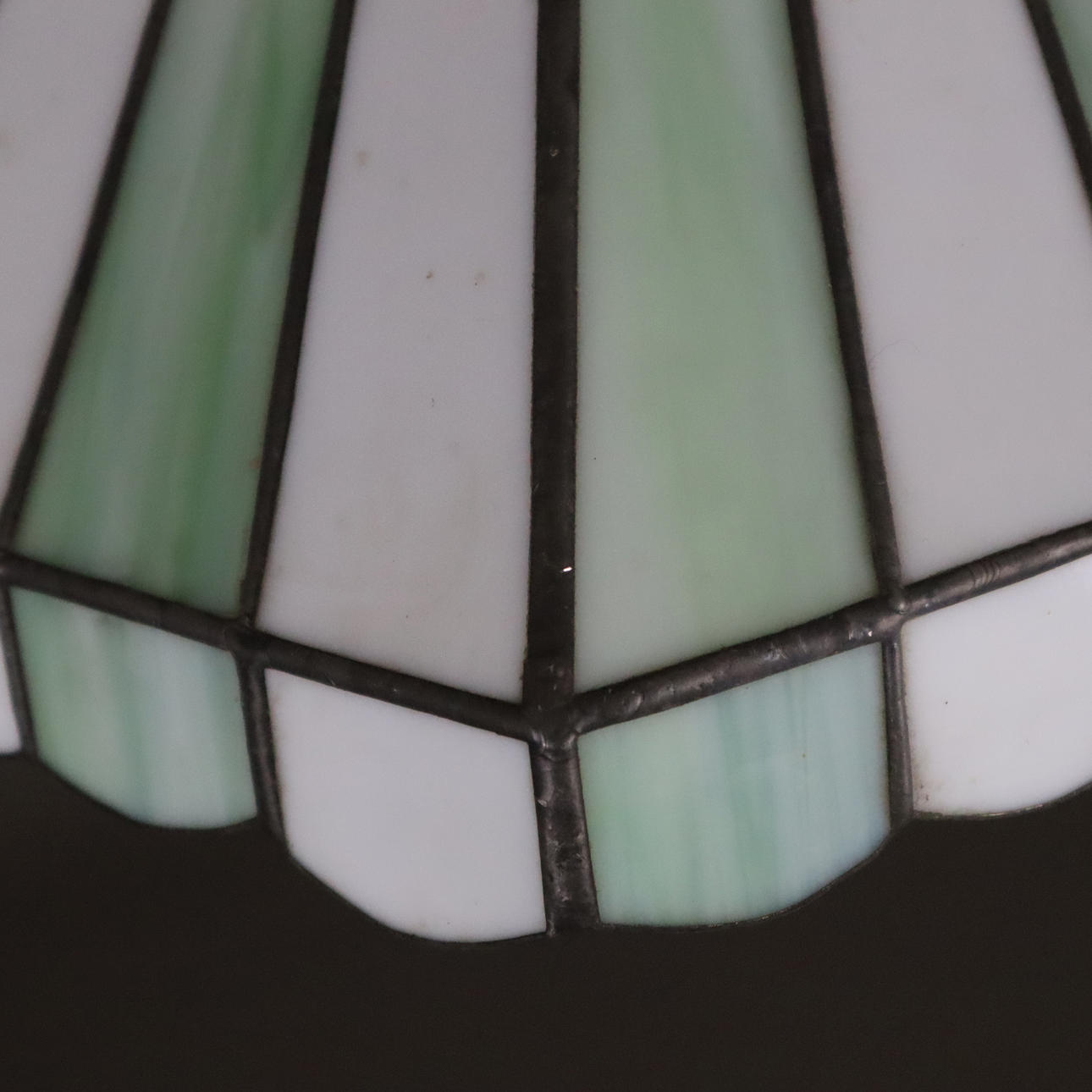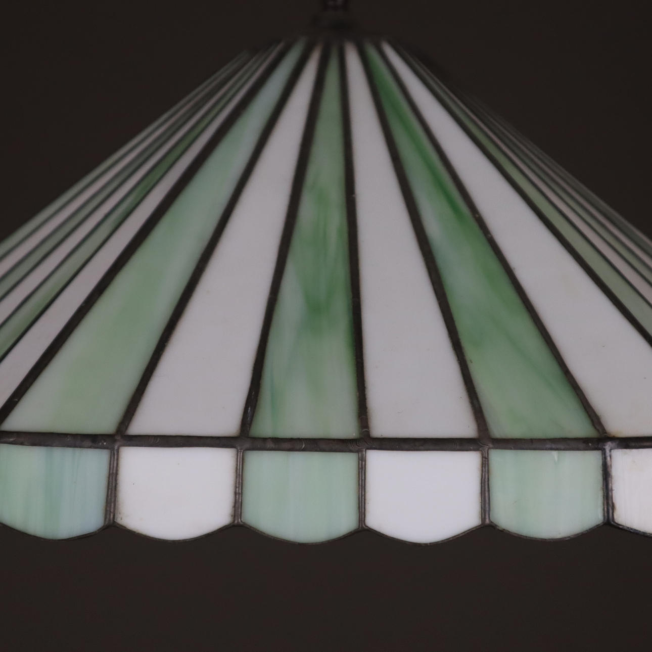 Hexagonal glass shade with lead strips, alternating green and white glass segments, one-lamp electrified, HxD: approx. 23x45cm, length with suspension (bell missing) up to approx. 75cm.