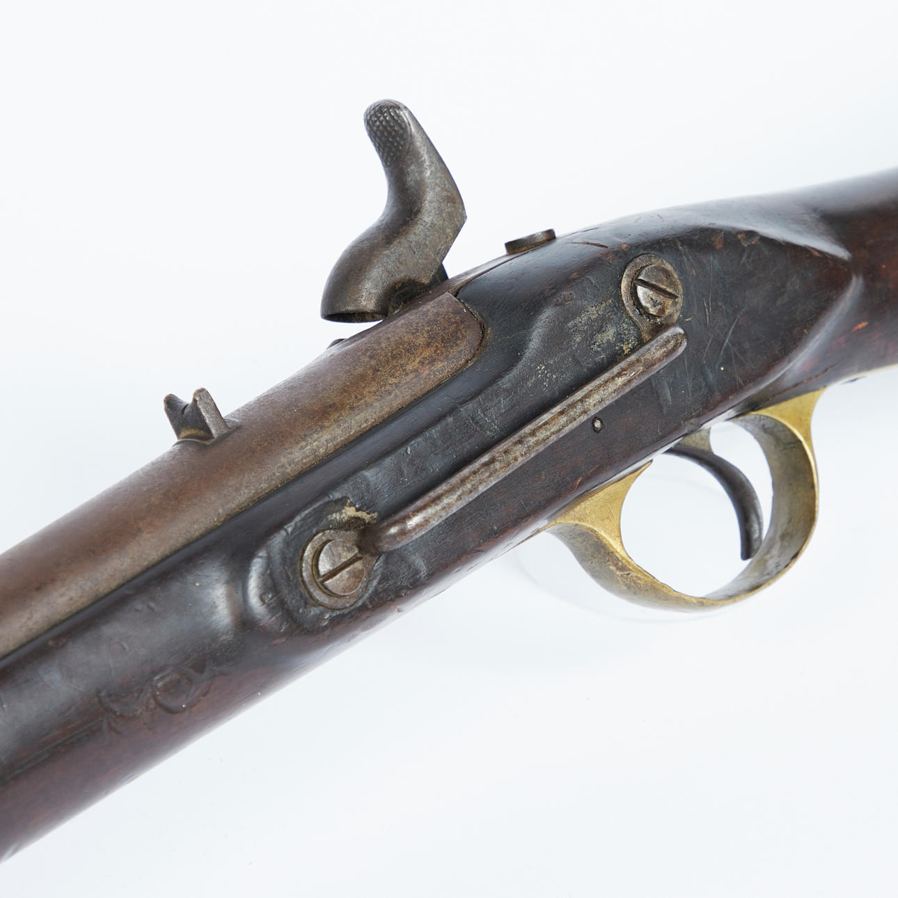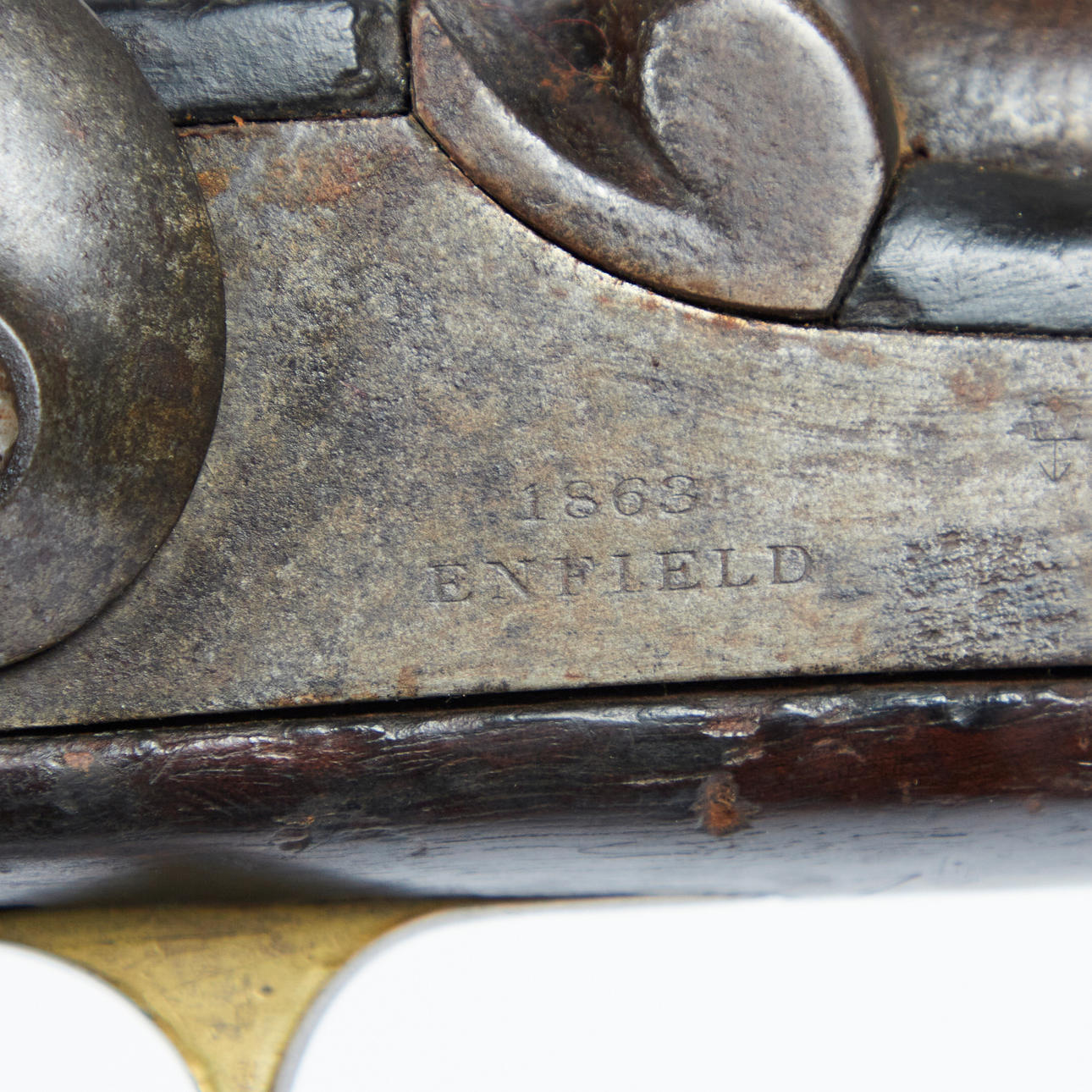 British cavalry muzzle-loading rifle, Enfield 1863. Rifle with percussion mechanism, wooden stock with iron fittings and ramrod, two barrel rings, trigger guard and forearm cap made of brass, stamped with national emblem and '1863 Enfield' on the lock plate and inscribed '18 E under crown' on the trigger guard, L.93cm, barrel length: 53cm .