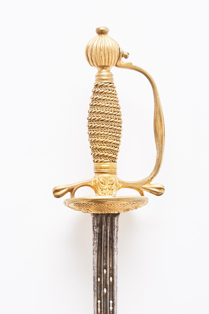 VÄRJA, Swedish, around 1760, for an infantry officer, double-edged openwork blade with engraved and gilded decoration, gilded brass mount with fluted button, reel winding of gilded twisted wire, length 94.5 cm PROVENANCE: Orres collection no. 428 See: Olof P. Berg's Swedish Small Arms, part 1 p. 45.