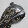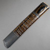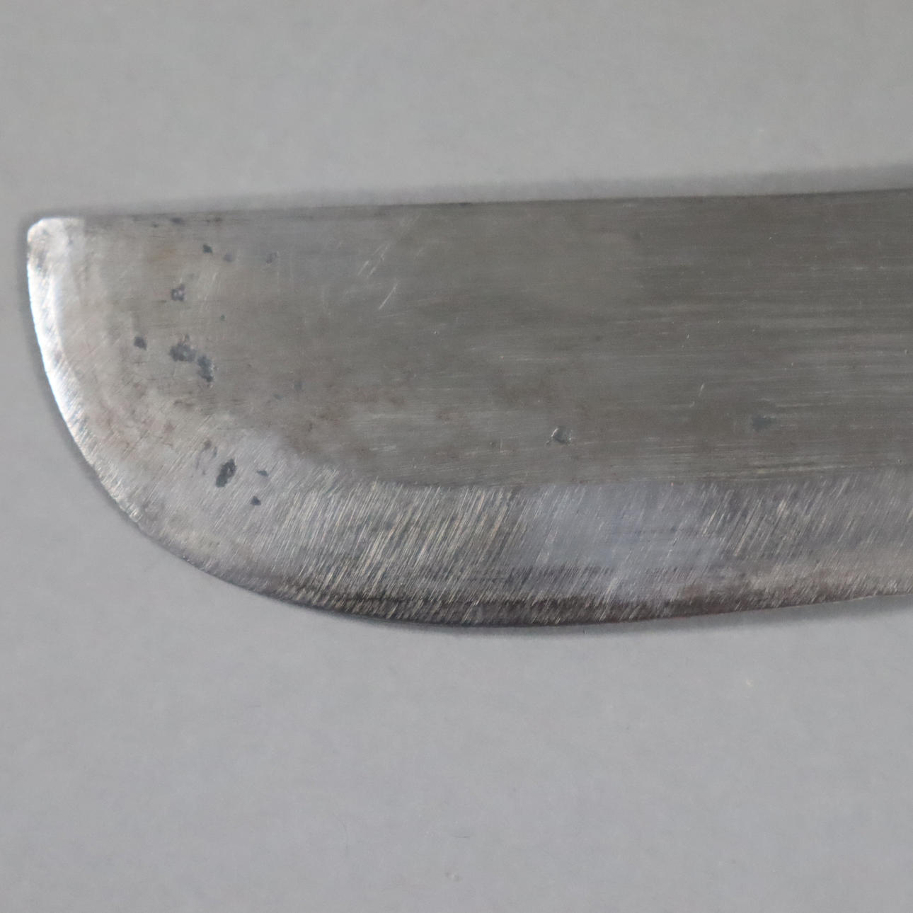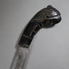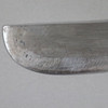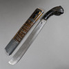 Heavy single-edged back blade, dark wooden handle ending in a plastic mythical animal head, light wooden scabbard with metal bands, blade length approx. 30 cm, total length with scabbard approx. 44 cm.
