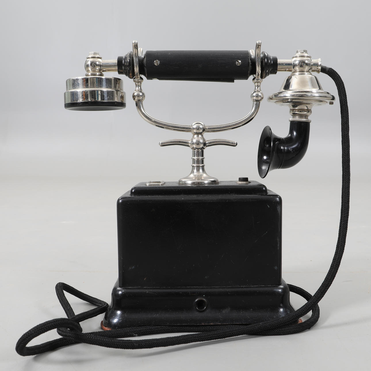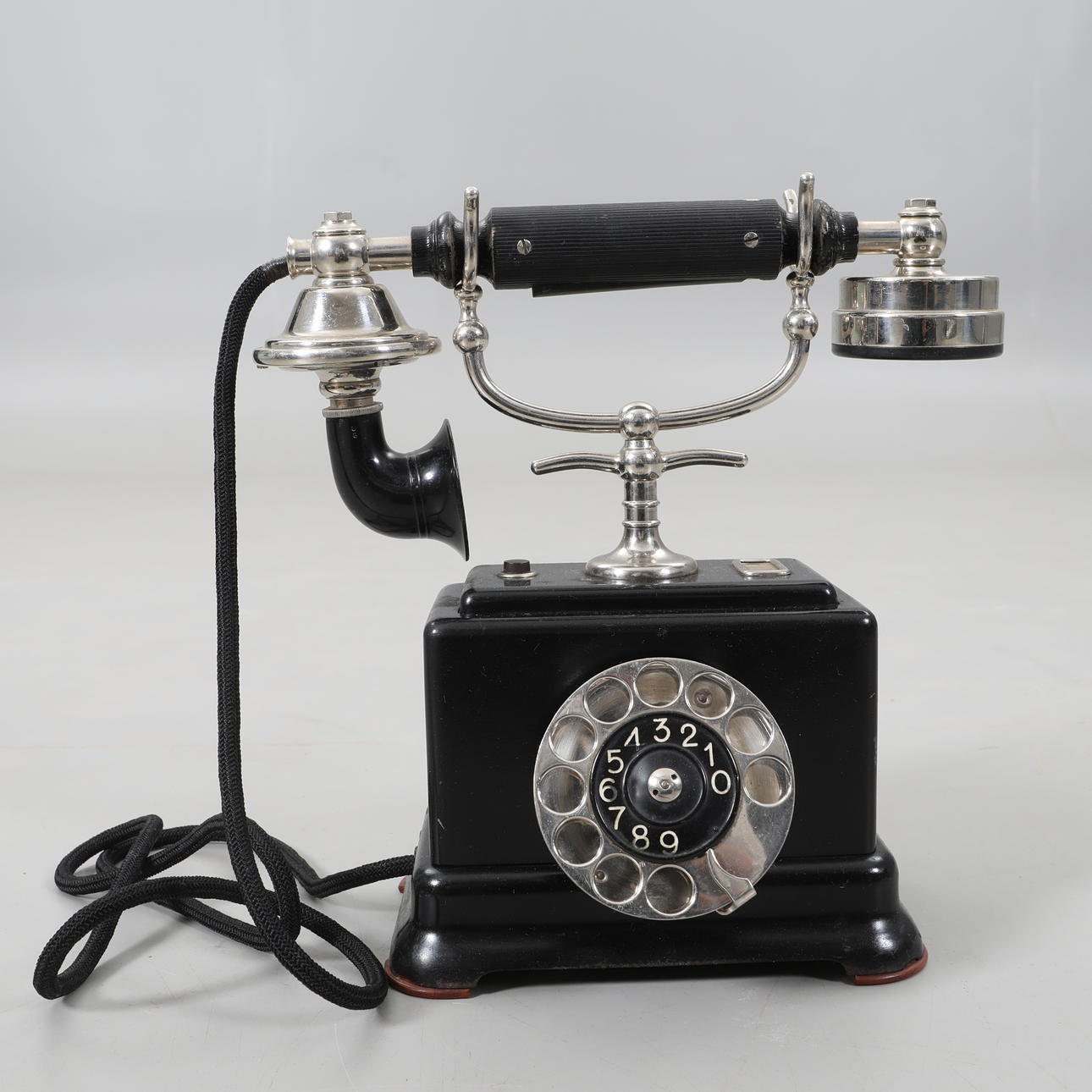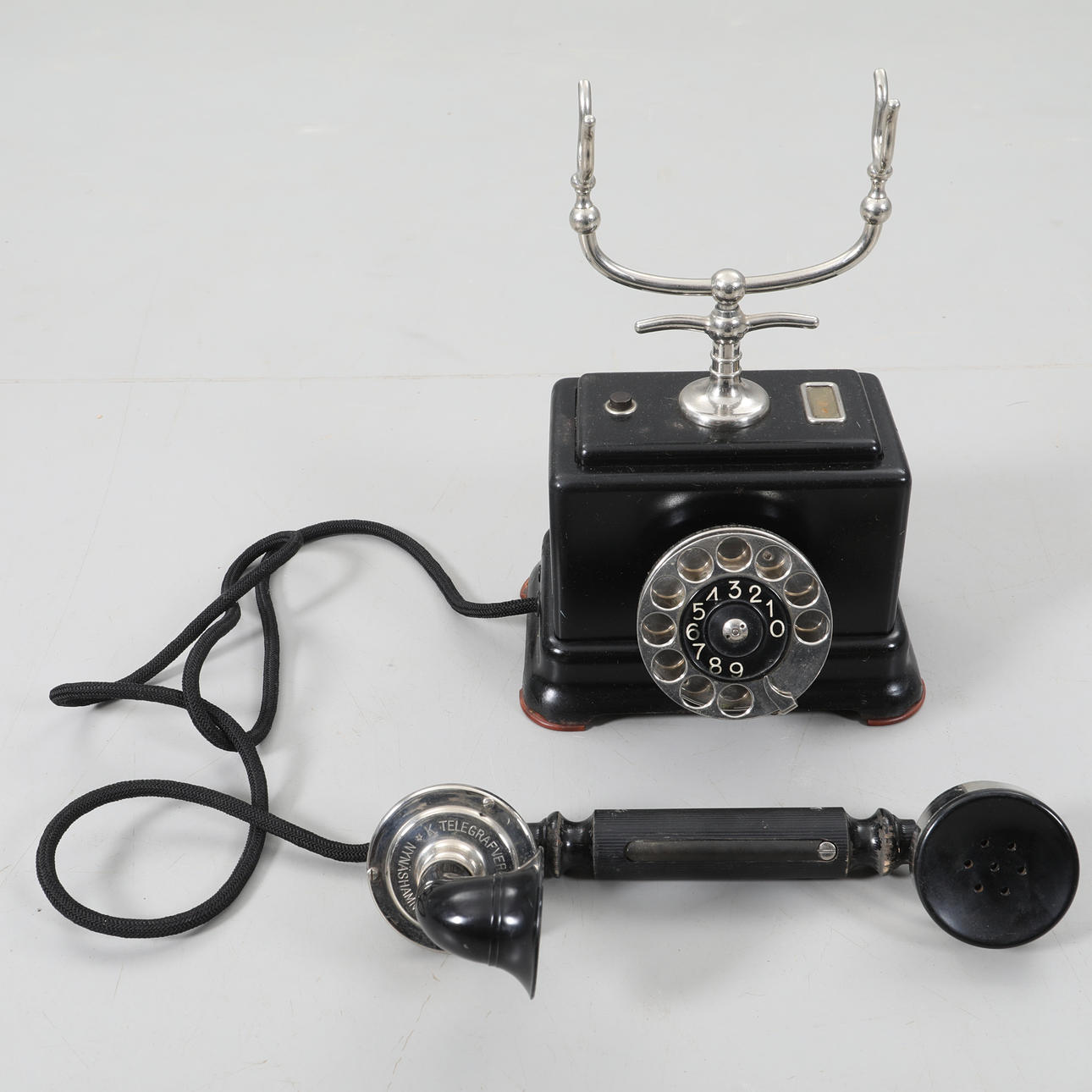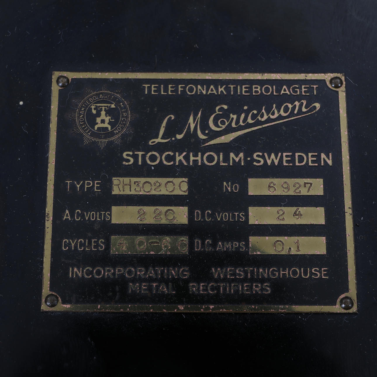 Desk phone Manufacturer LM Ericsson Handset from K. Telegrafverket's workshop, Nynäshamn Height approx. 26 cm Transformer/rectifier Manufacturer LM Ericsson, Stockholm.