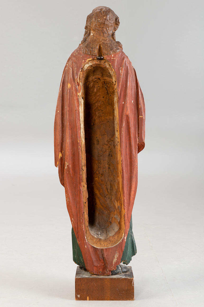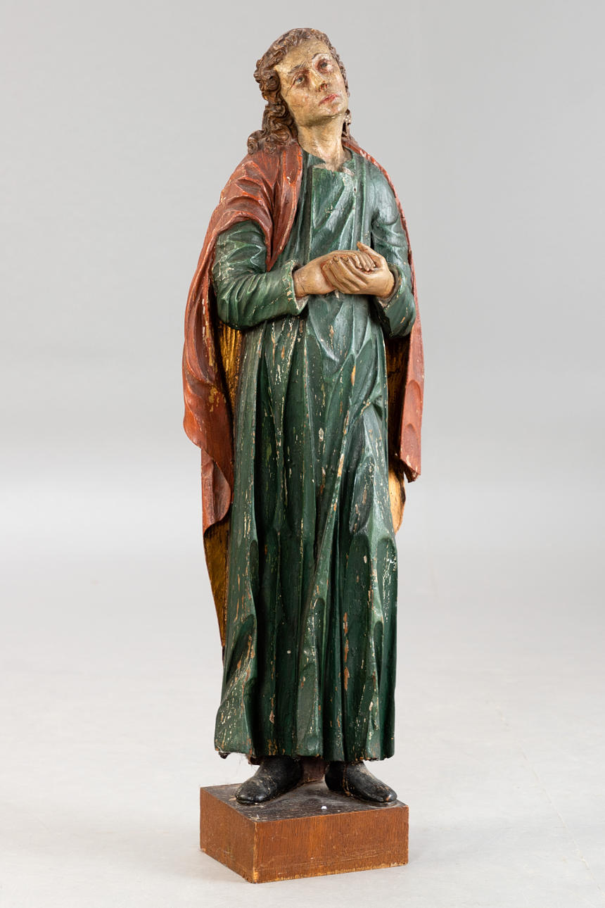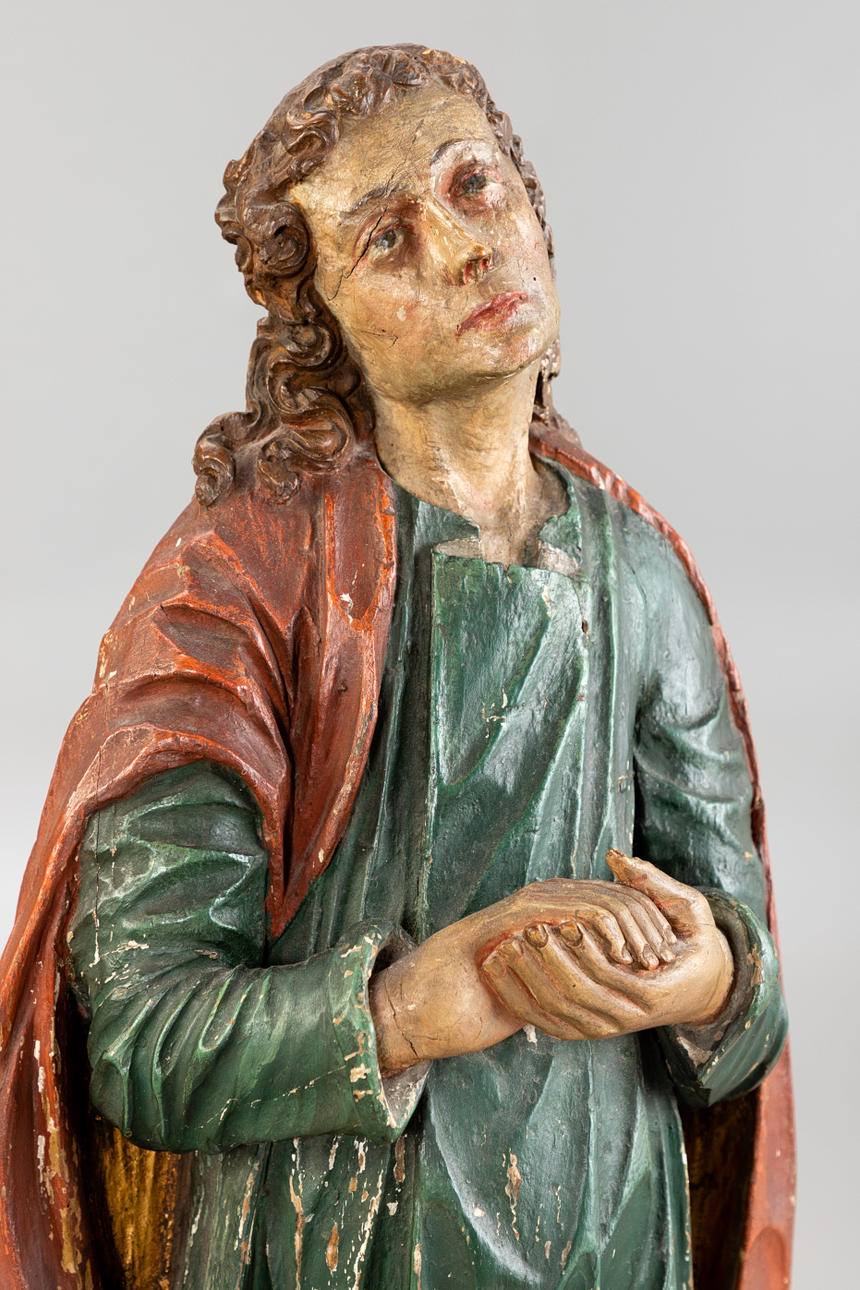 Linden wood, painted. Figure cut in a three-quarter round, hollowed out on the back. In a devotional pose, the robe with steep folds. H: approx. 95 cm (without base).