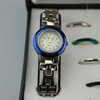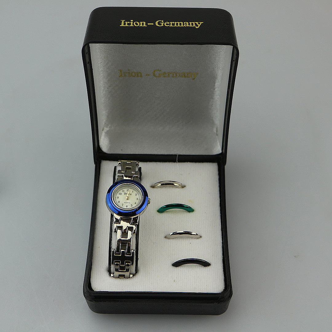 Quartz movement, with interchangeable rings, case diameter: 24 mm.