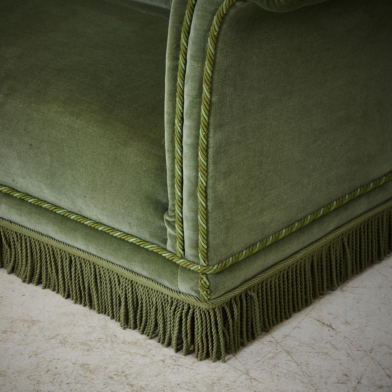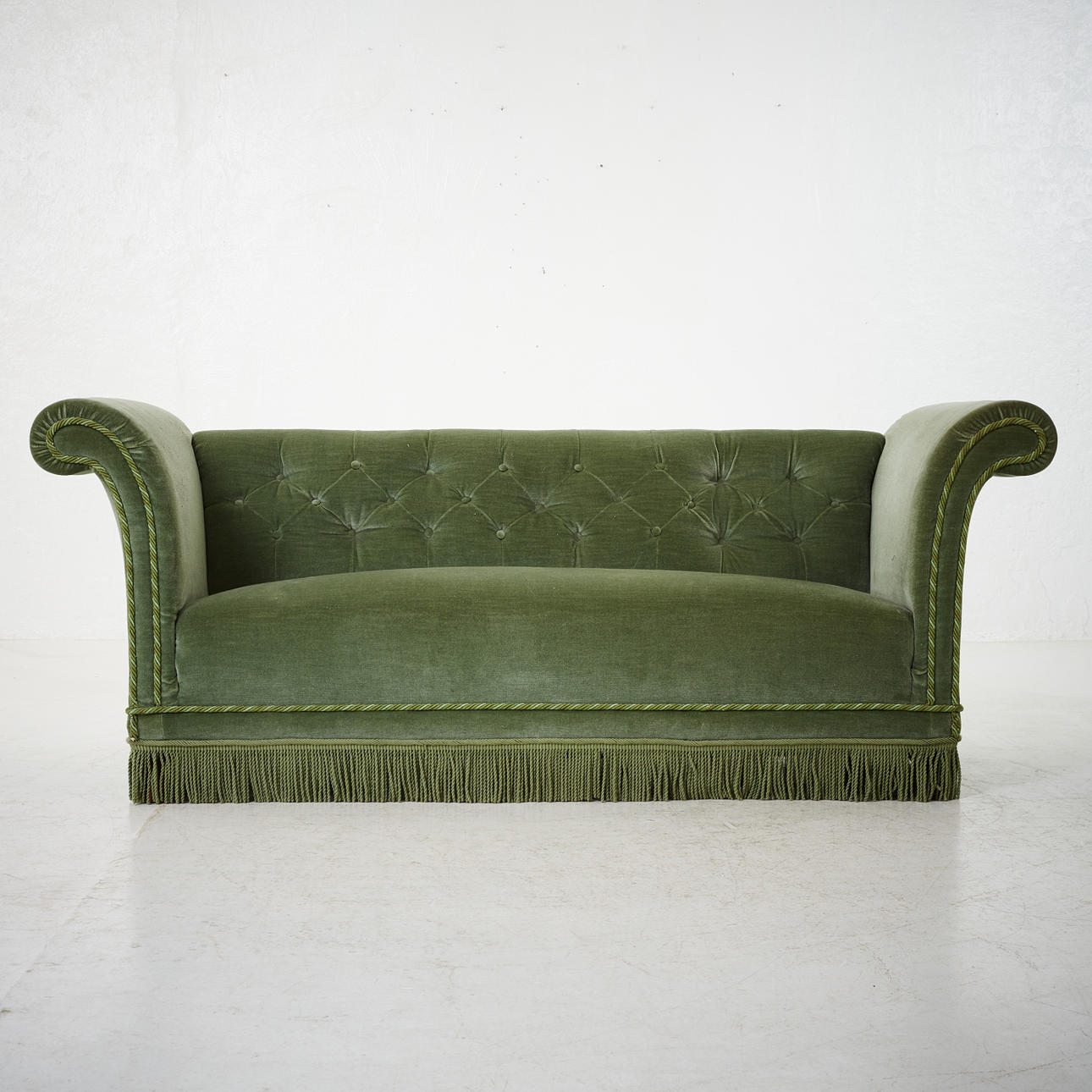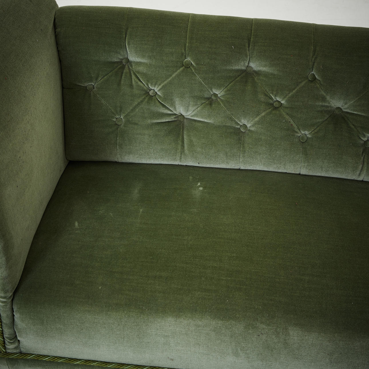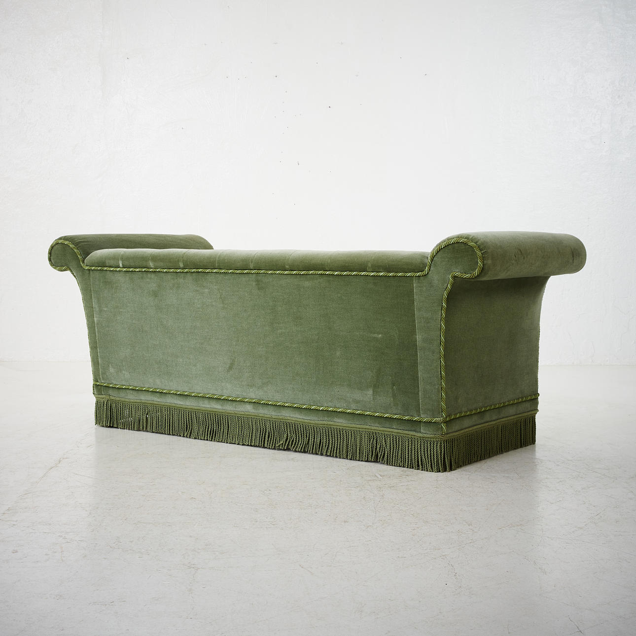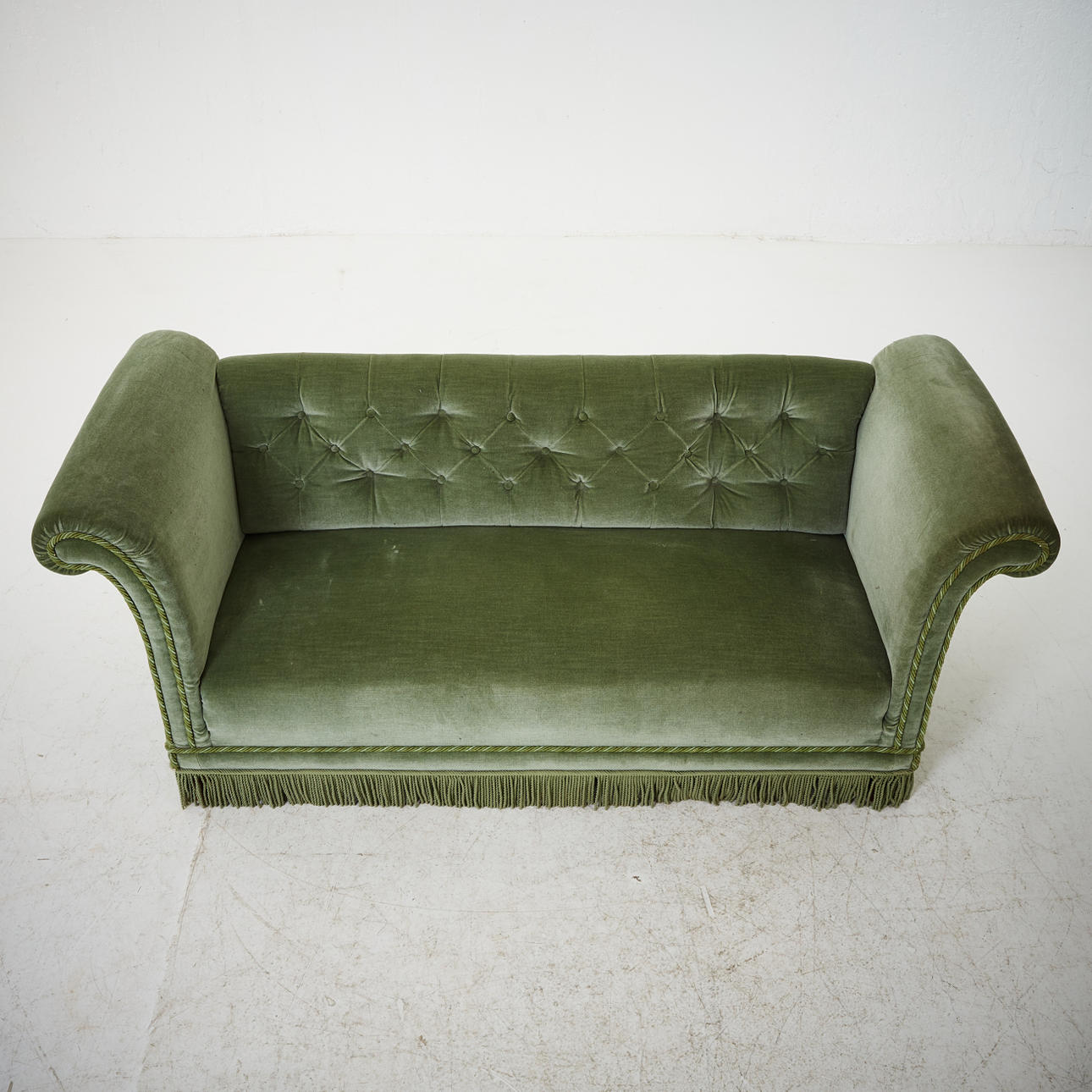 Puffy shape padded light green upholstery. Lower back than armpits. Length 184 cm. Seat height 37 cm.