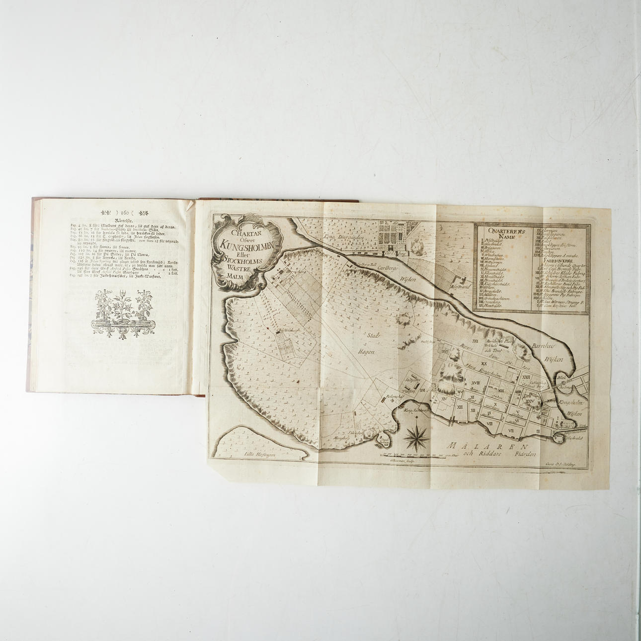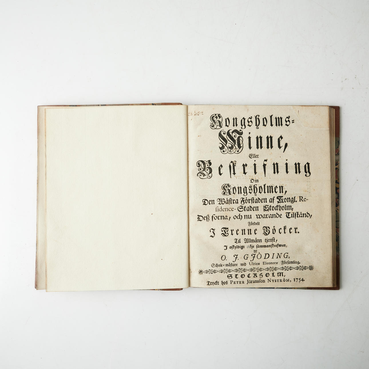 KUNGSHOLMEN 1754. GÖDING, OLOF JUSTINUS. Kongsholms-minne, or description of Kongsholmen, the western suburb of Kongl. the residence city of Stockholm, its former and current state, divided into three books. For public service, in innocent pleasure samskrefwen , by OJ Gjöding, schole-master wid Ulricae Eleonorae parish. Stockholm, with Peter Jöransson Nyström, 1754.