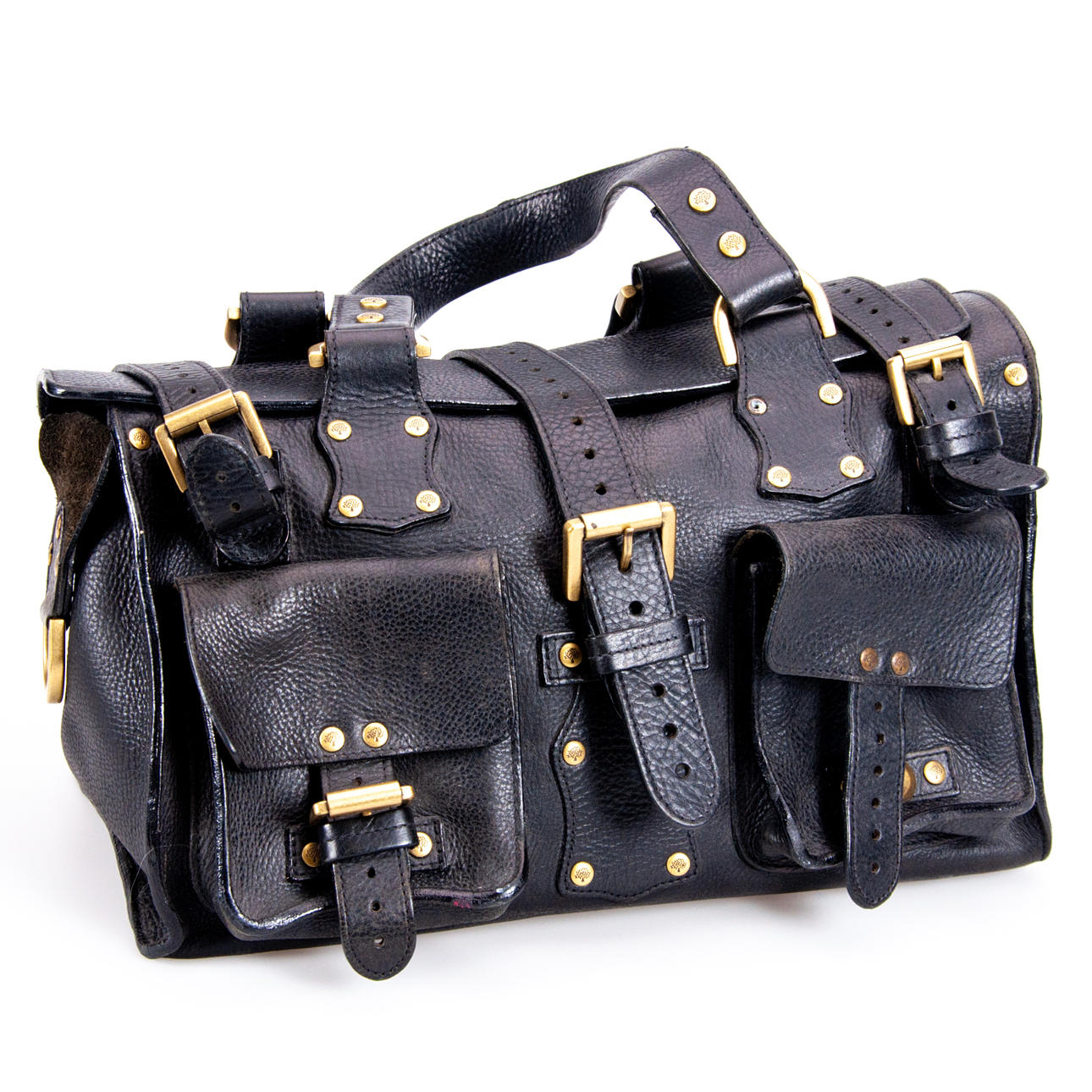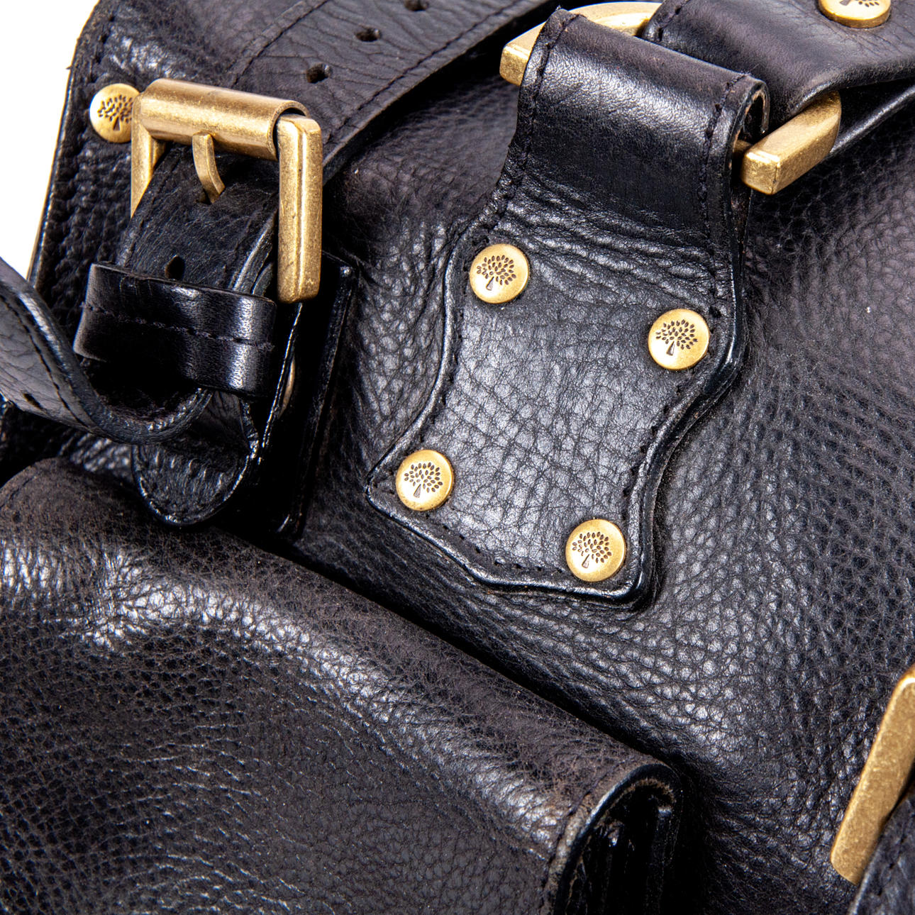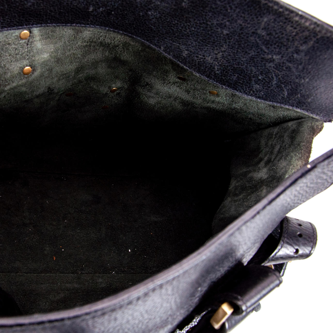 Normal wear and tear A metal buckle is missing on a front pocket Shoulder strap is missing.
