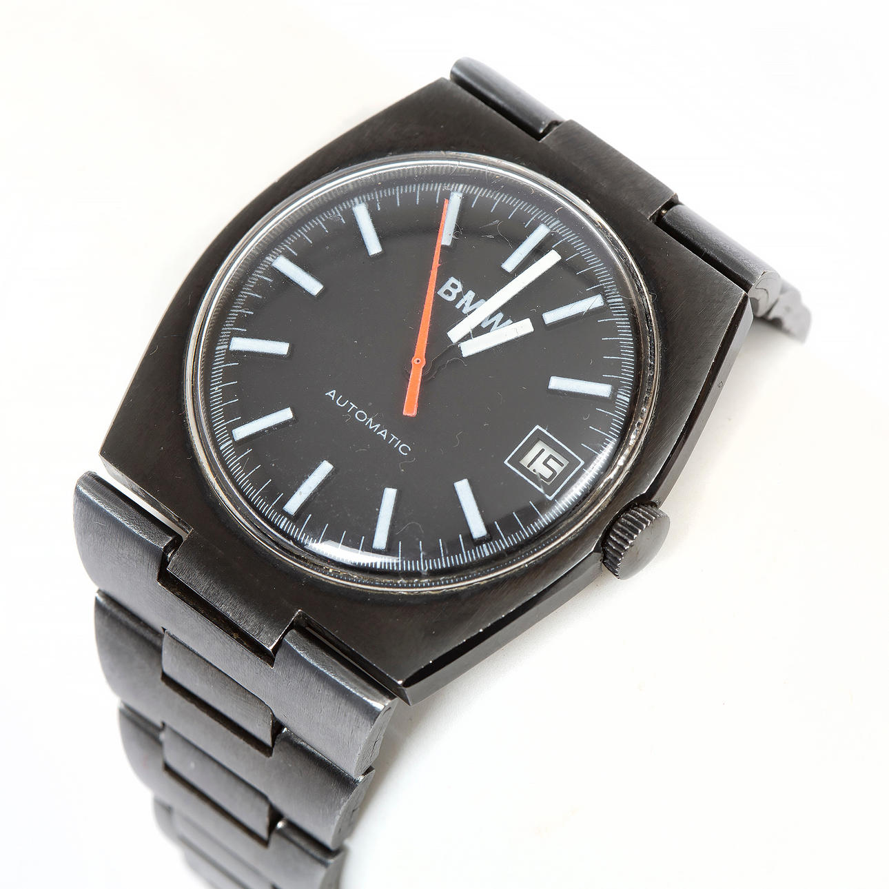 Blackened steel, automatic, plexiglass, date, original link, folding clasp, PUW 1561, inner dimensions 19.5, case dimensions 37x36 mm.