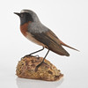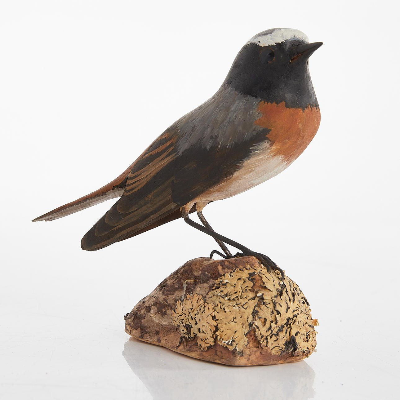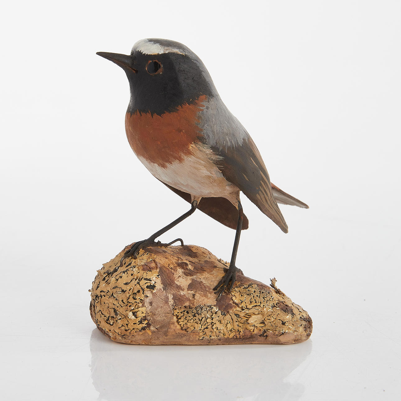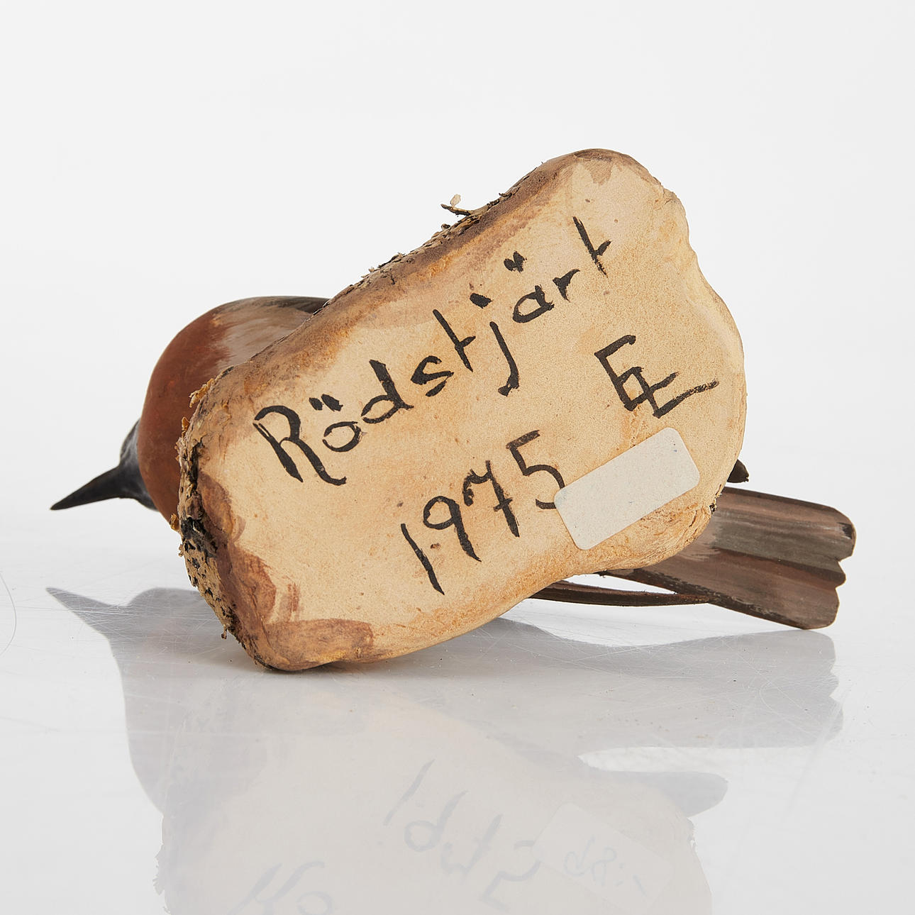 Hand-cut and painted wood, monogram signed and dated "EL 1975 Rödstjärt", height 9.5, length 10cm