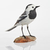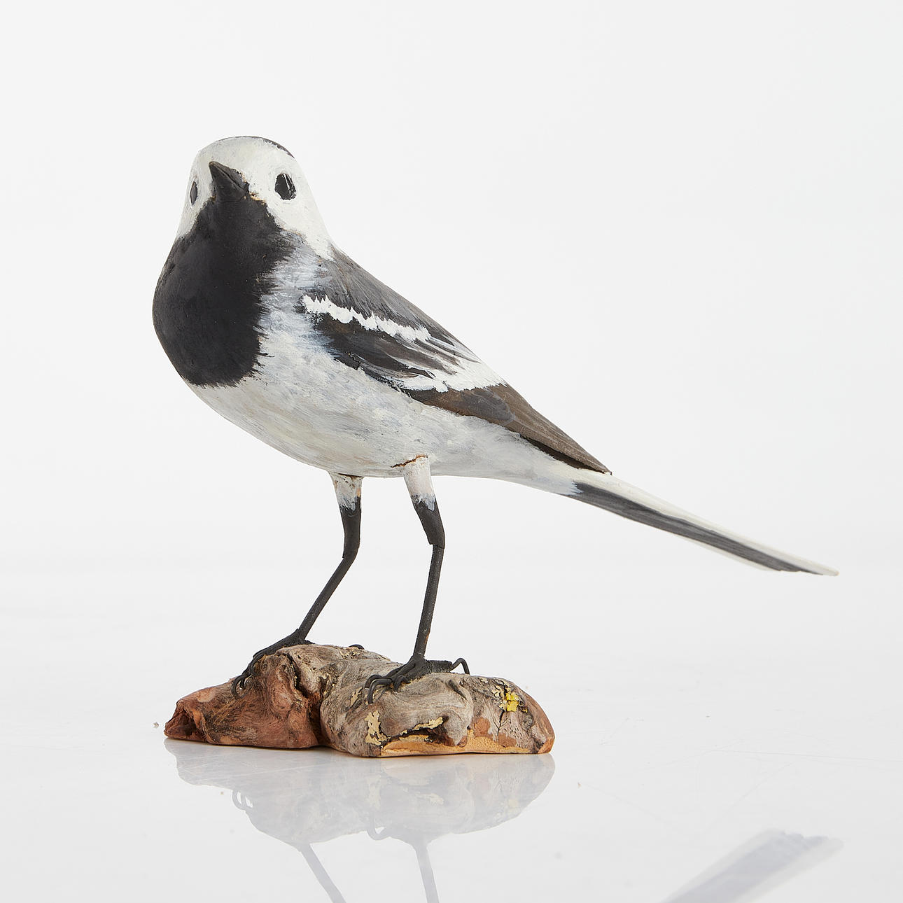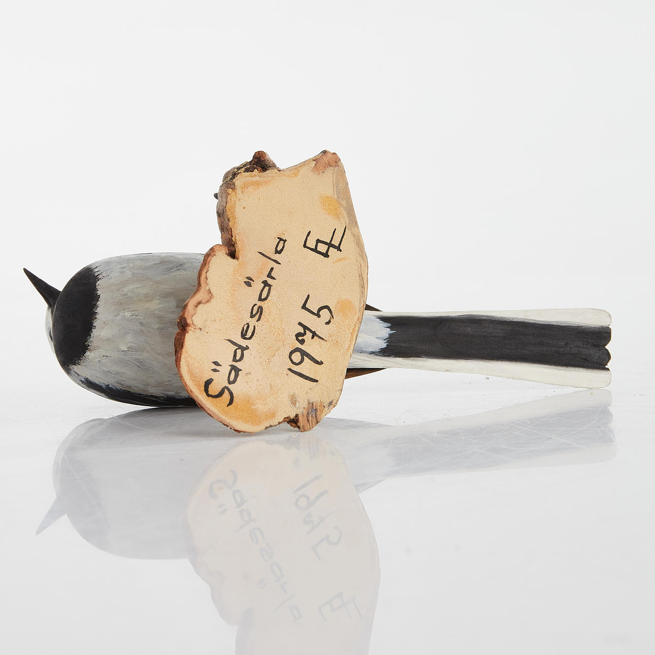 Hand-cut and painted wood, monogram signed and dated "EL 1975 Sädesärla", height 9.5, length 15cm