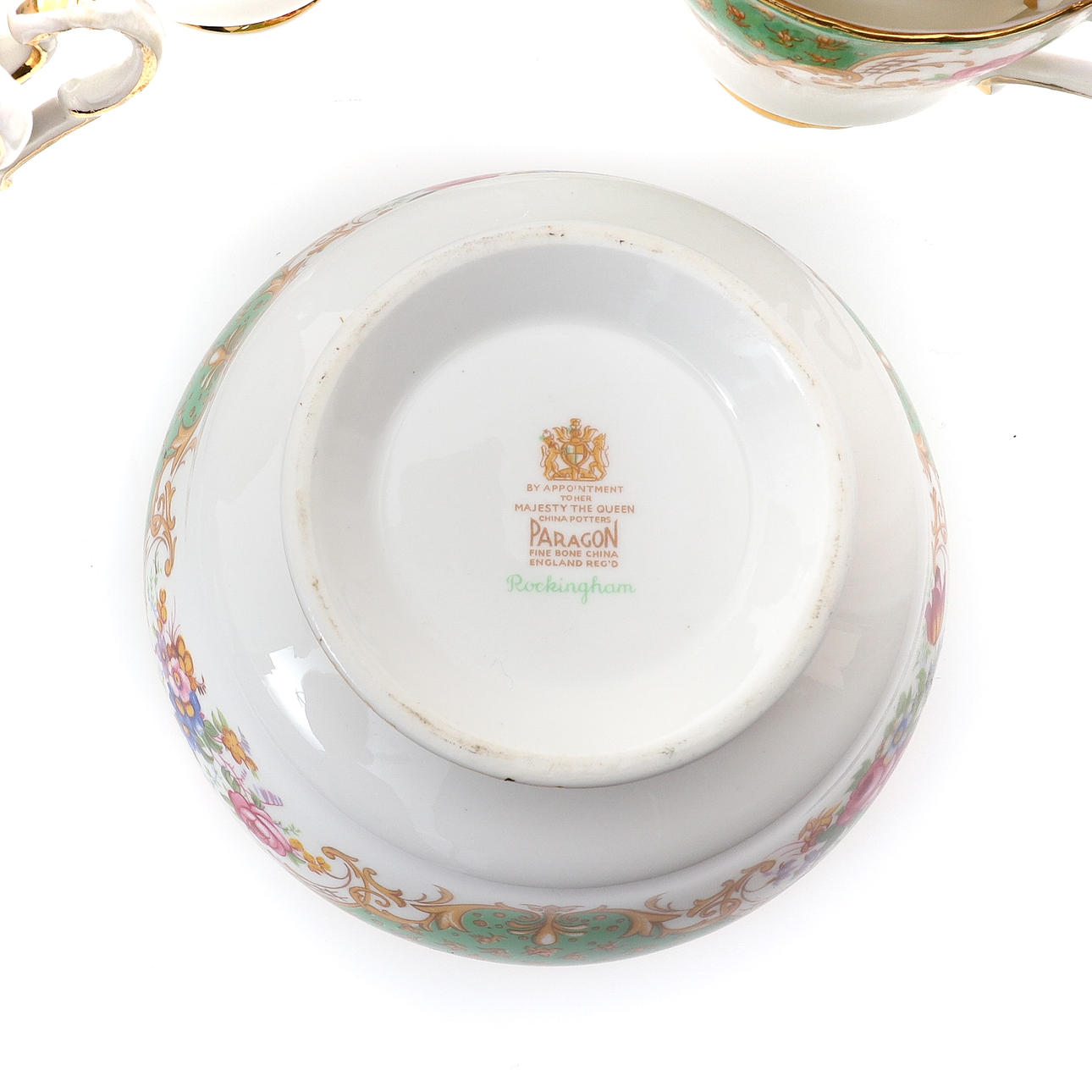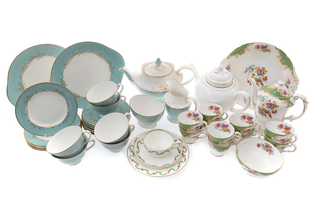 comprising, teapot, six cups, six saucers, six tea plates, pair of bread and butter plates, milk jug and sugar basin, a Paragon Rockingham pattern thirteen piece part coffee service, comprising, coffee pot, sugar basin, bread and butter plate, and eight cups, a Royal Worcester silver shape white glazed teapot, with gilt banded decoration, 27cm across, and a Crescent China tea cups, saucer and plate (40).