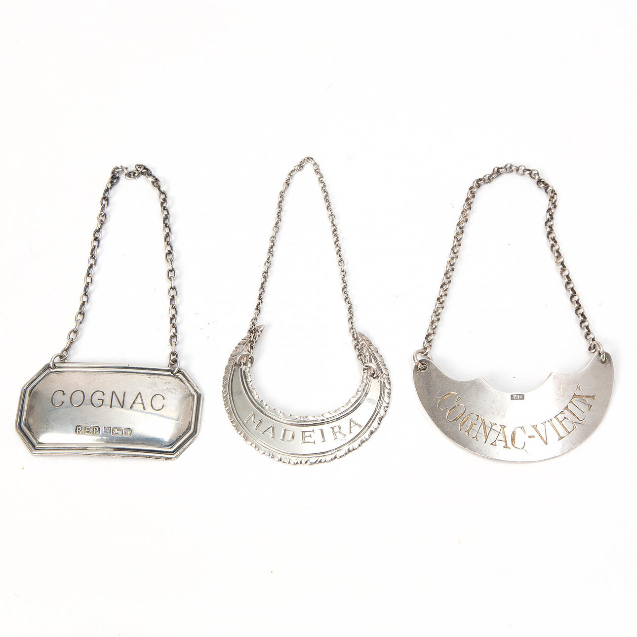 2209283. CARAFE LABELS, 3 pcs, silver, England.