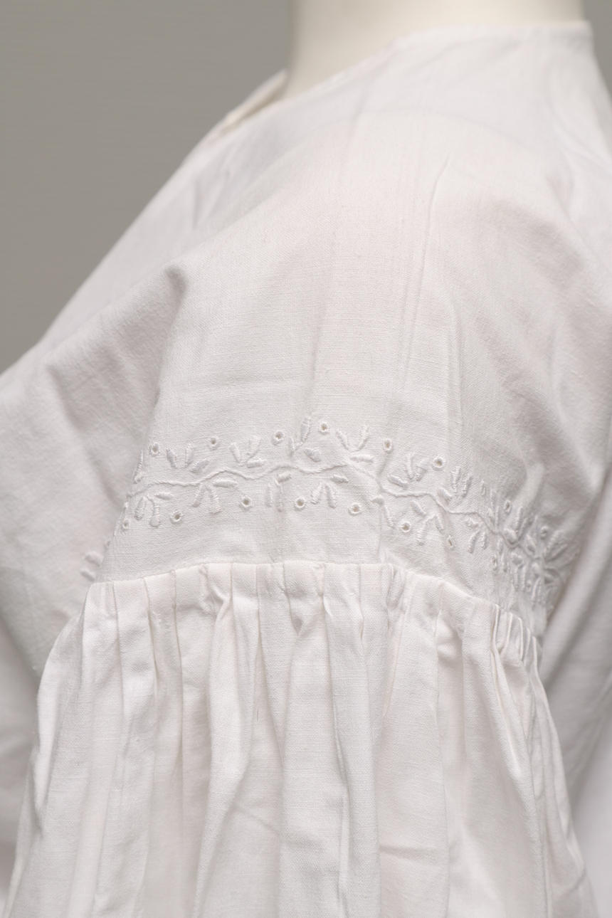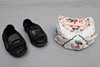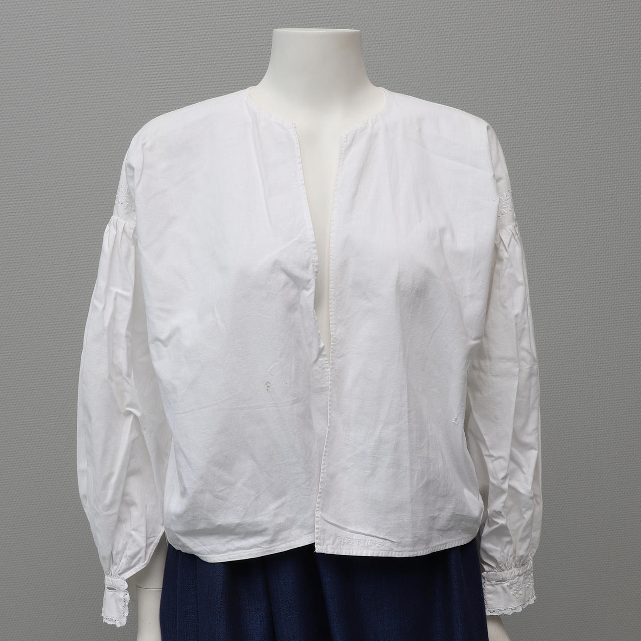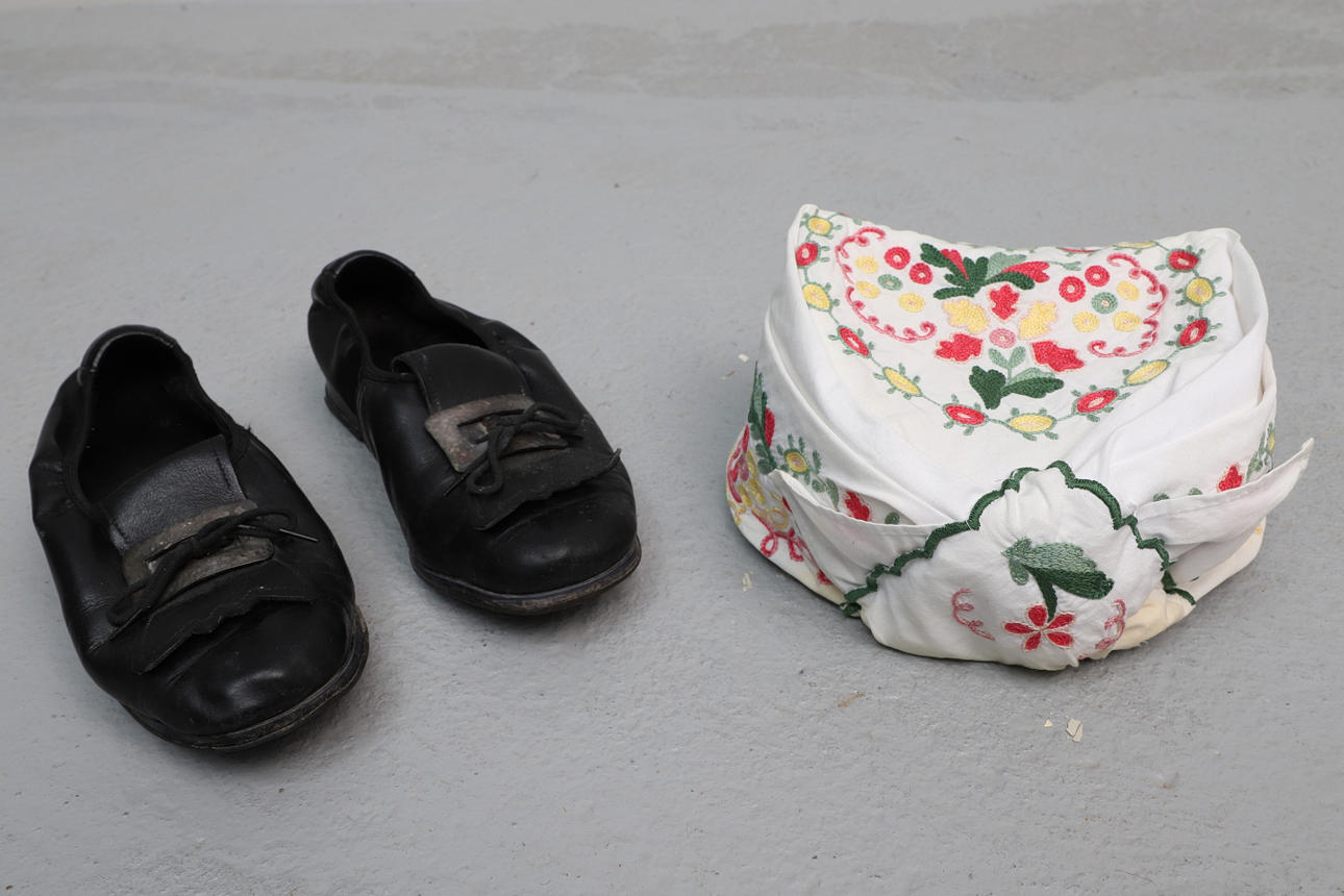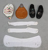 Blouse, white with lace Apron, woven in pale colors, length approx. 79 cm Hat, inner circumference approx. 52 cm Leather purse, length approx. 26 cm Collar Shoes with heel, leather, inner length approx. 22 cm.