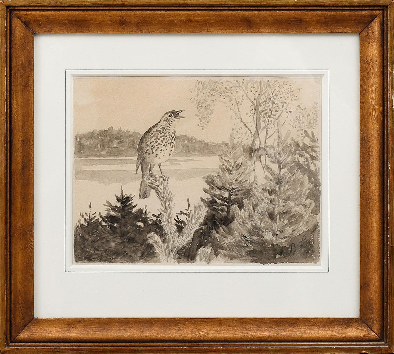 BRUNO LILJEFORS. Pine thrush, ink wash, signed BL.