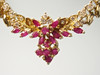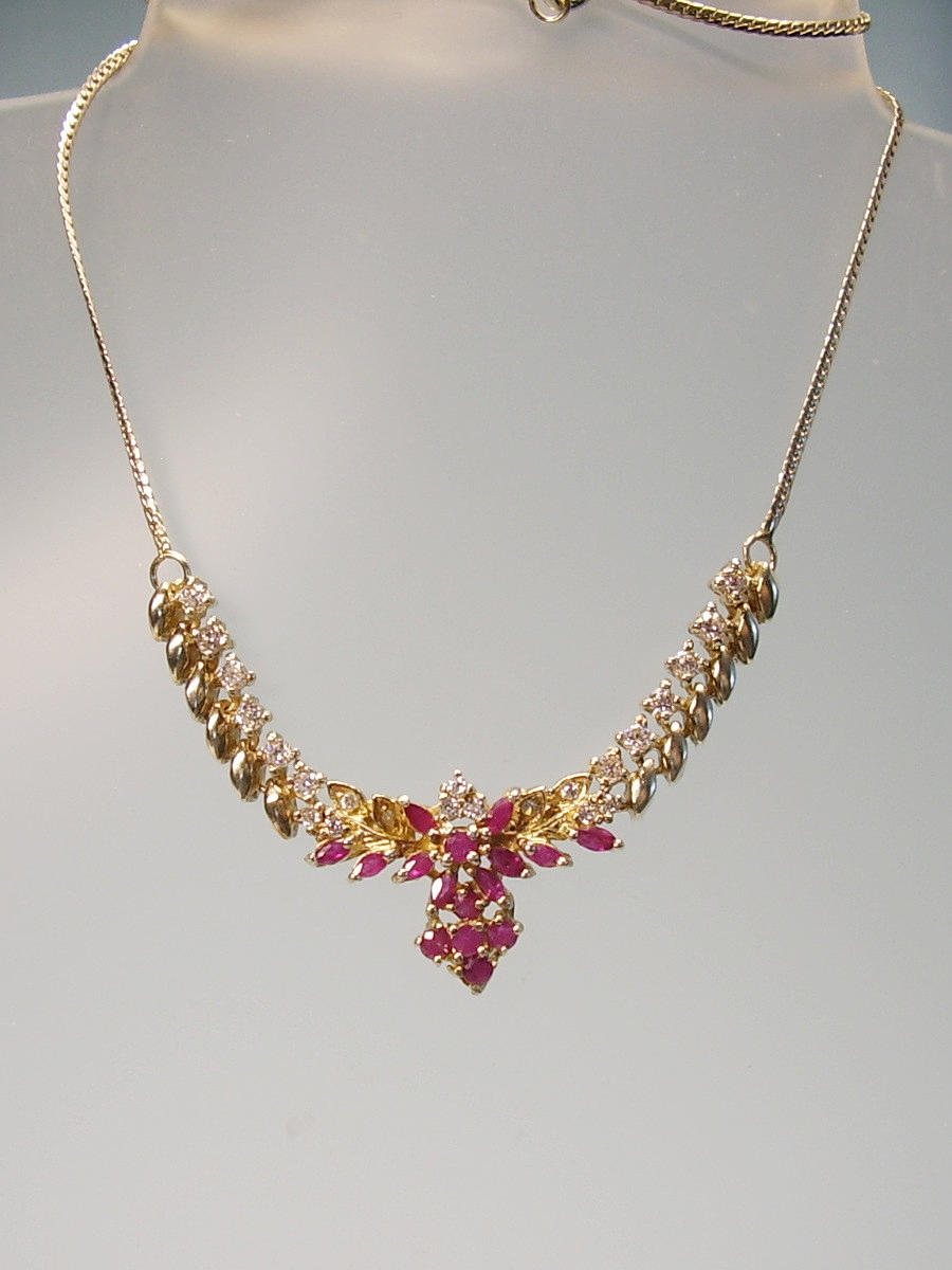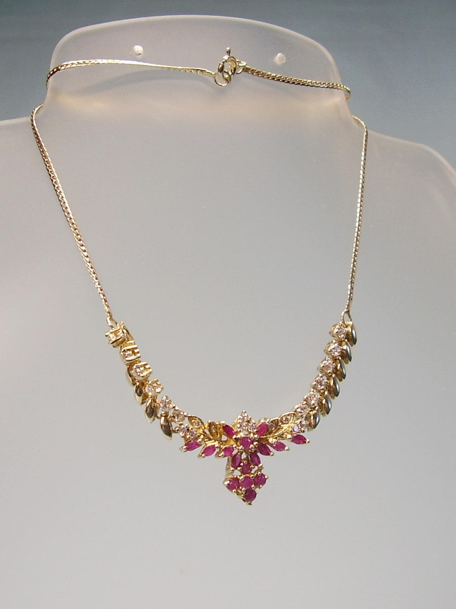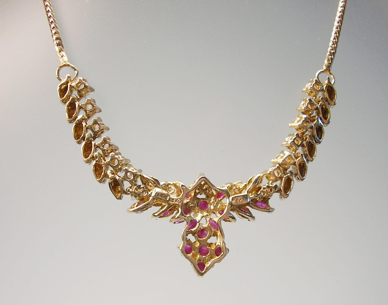 The elegant necklace is made of 925 silver, hallmarked and gilded in 14 carat yellow gold. The middle part is set with 15 faceted natural marquise and brilliant cut rubies and 19 round faceted white topazes.