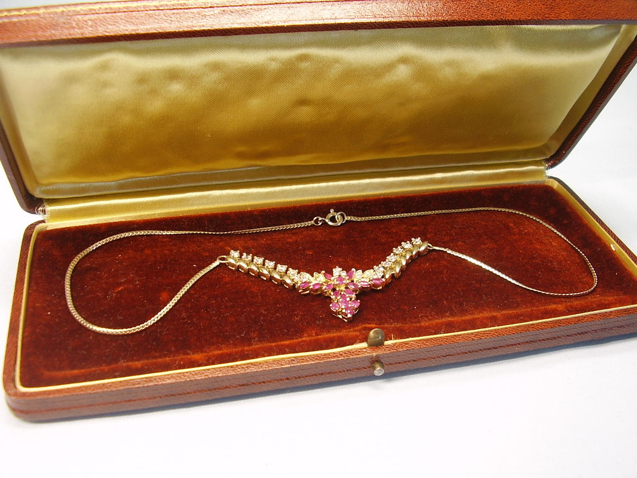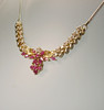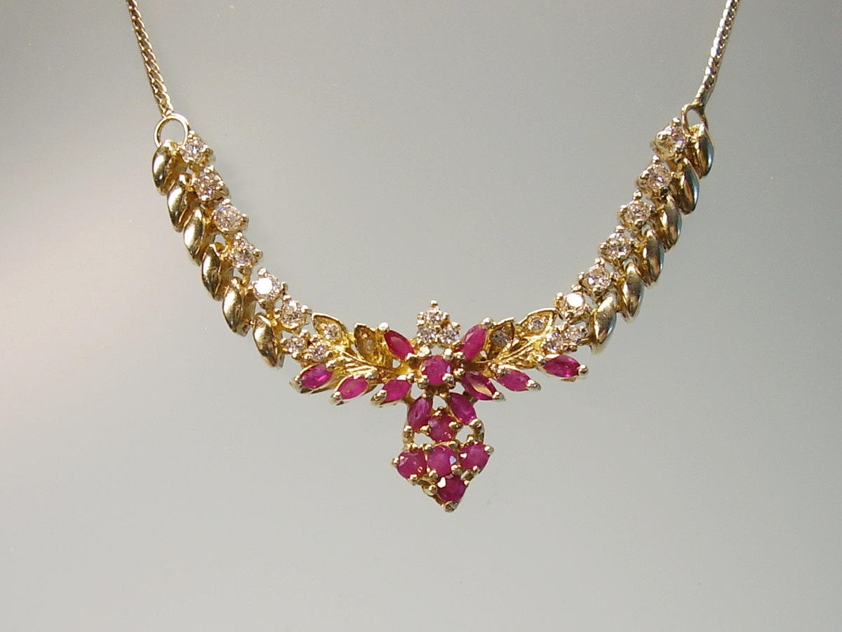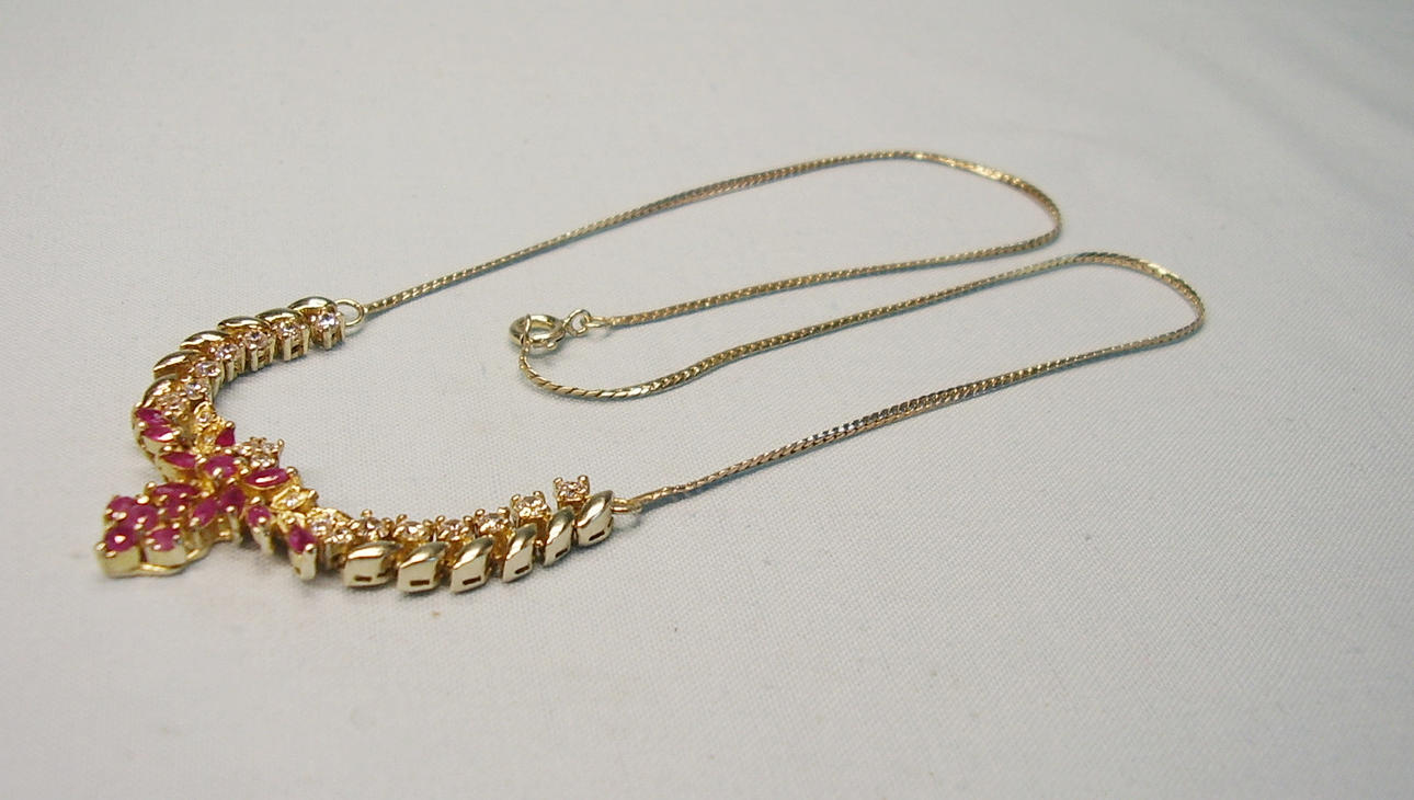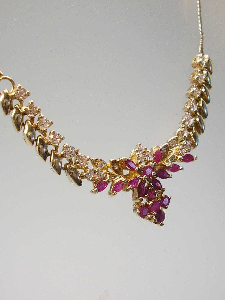 The elegant necklace is made of 925 silver, hallmarked and gilded in 14 carat yellow gold. The middle part is set with 15 faceted natural marquise and brilliant cut rubies and 19 round faceted white topazes.