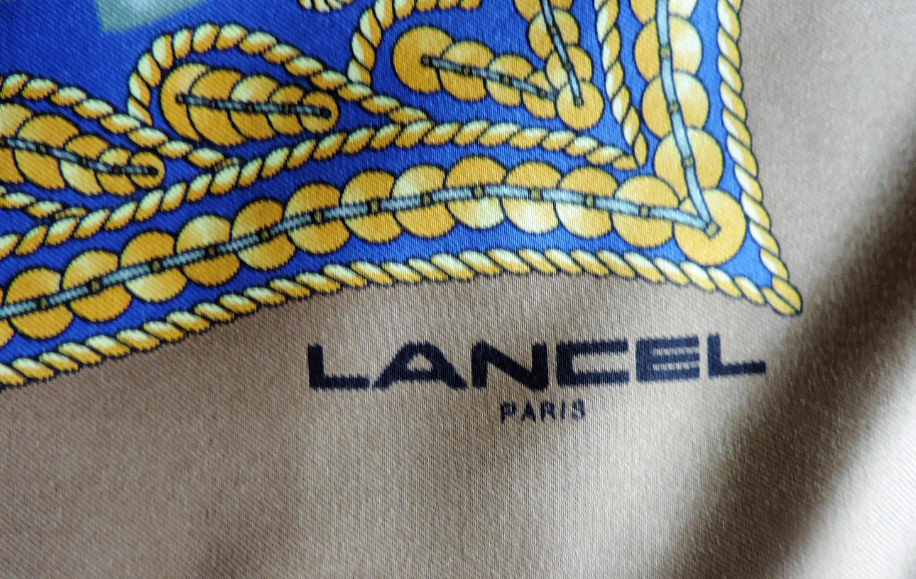 A vintage silk scarf by Lancel Paris circa 1980's. Blue & gold floral decoration on a mink colour background. Signed Lancel Paris the scarf measures 35 inches (88cm) square and is finished with hand rolled hems.