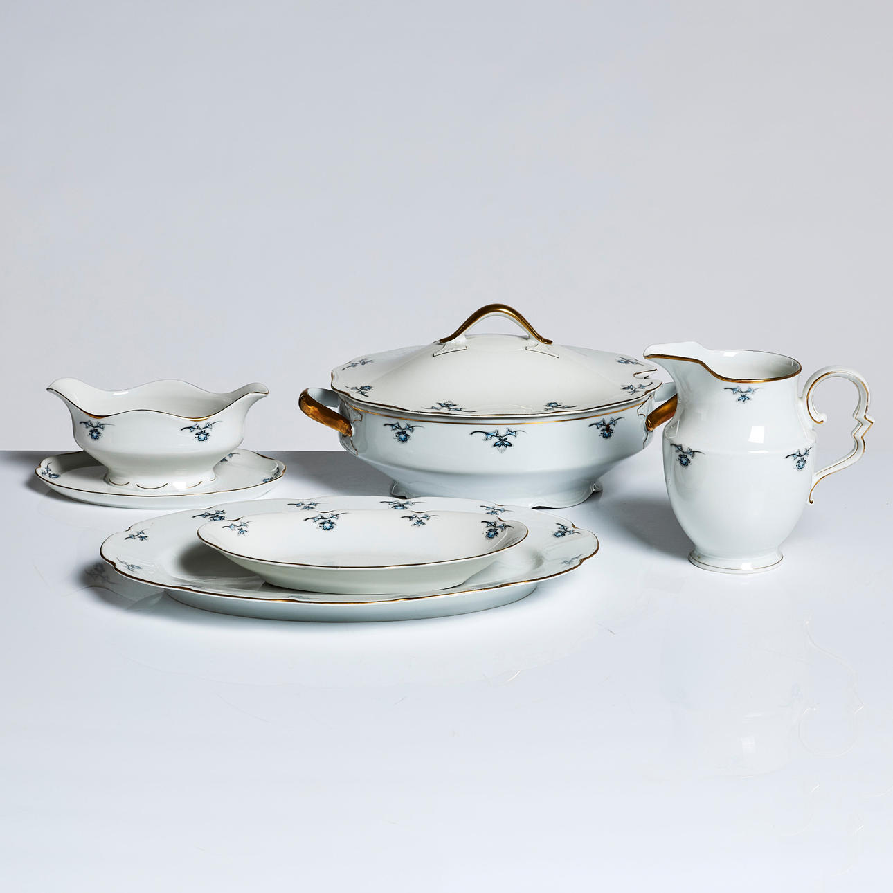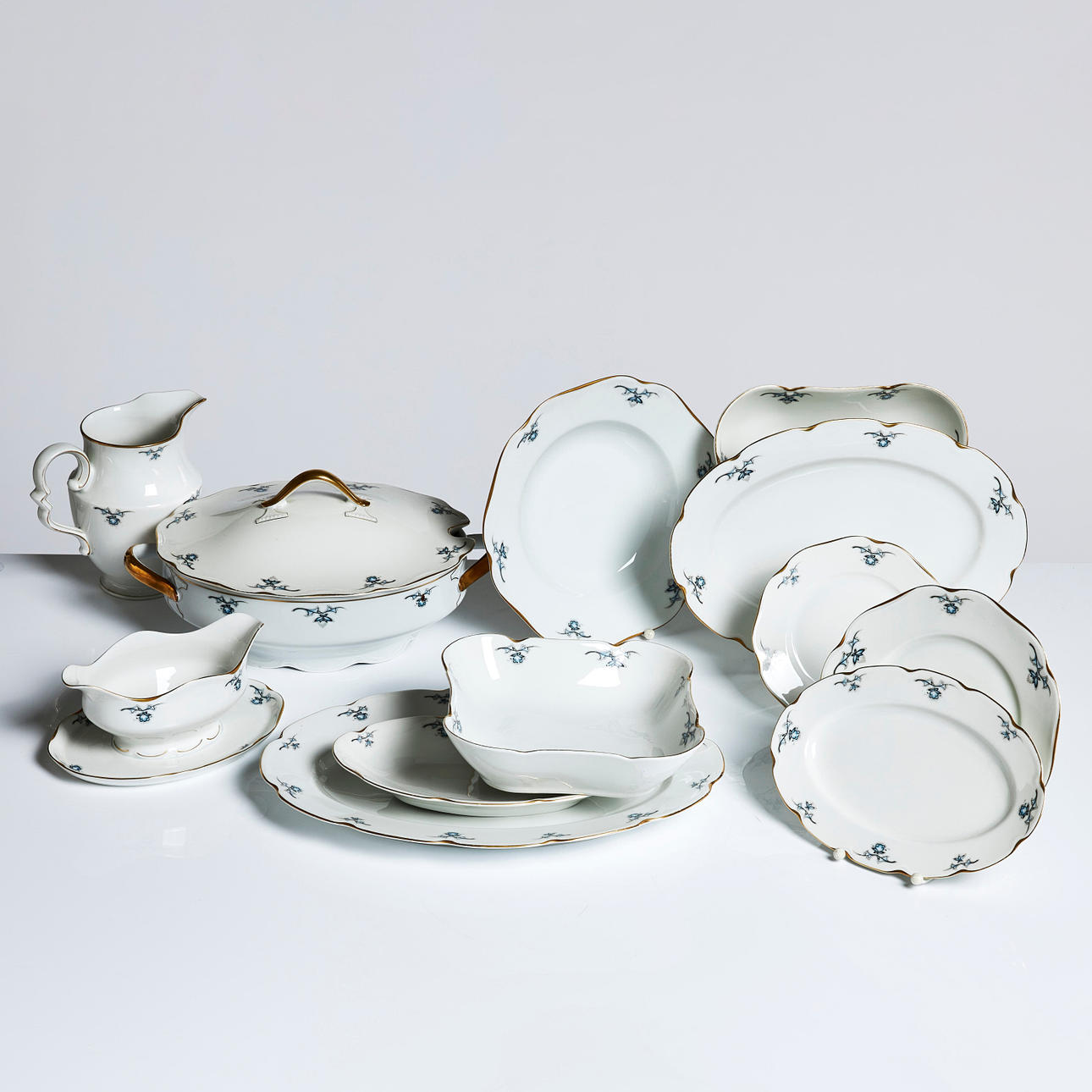 Consisting of: 23 deep plates diameter approx. 25 21 plates 25 22 plates 22 21 platters 18 9 oval platters 24.5-38.5 3 square platters 21 1 square platter 23 2 jugs height 17 2 terrines with cover length 35 1 saucers length 22 cm.