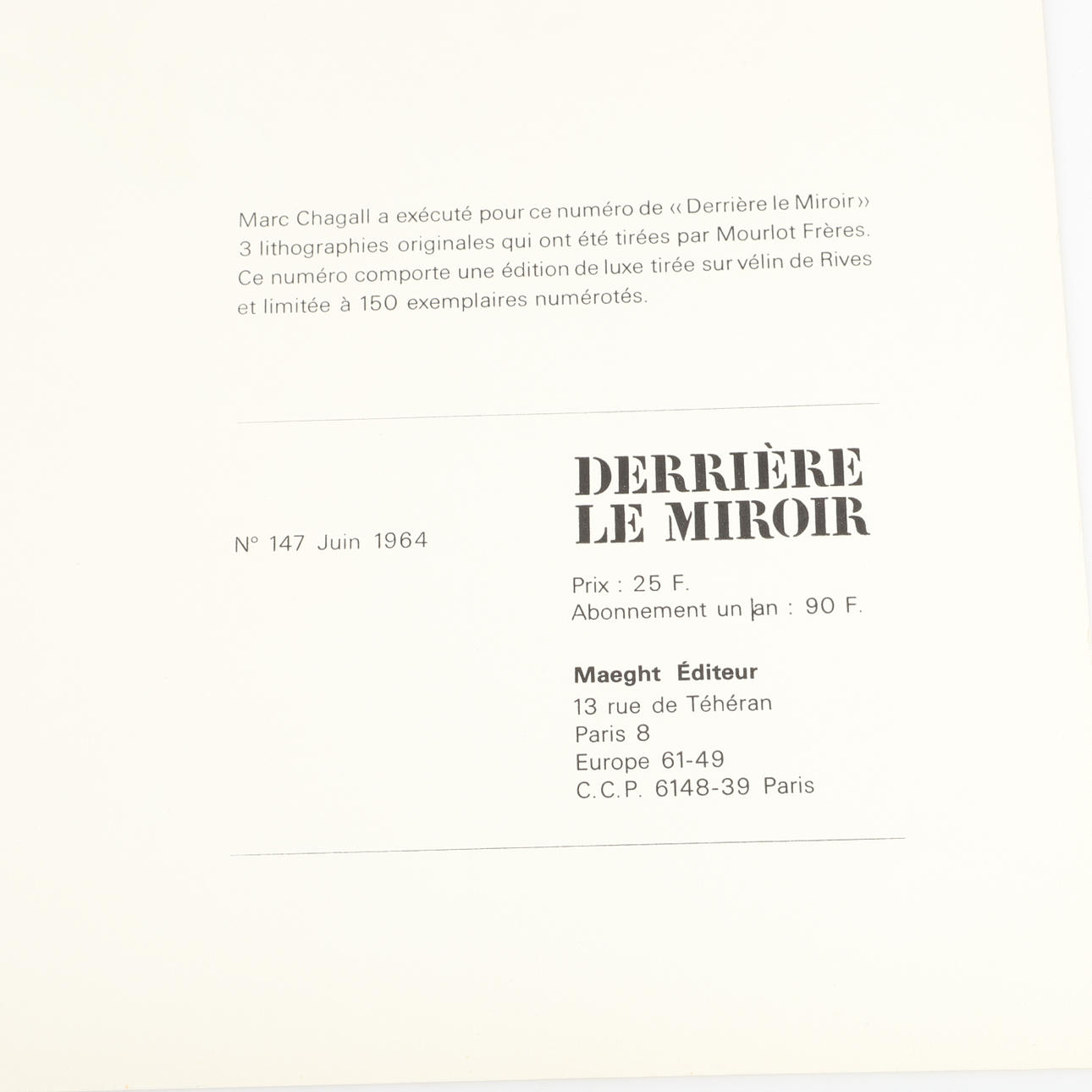 2226327. MARC CHAGALL. Derrière le miroir, No. 147, 1964.