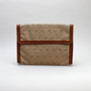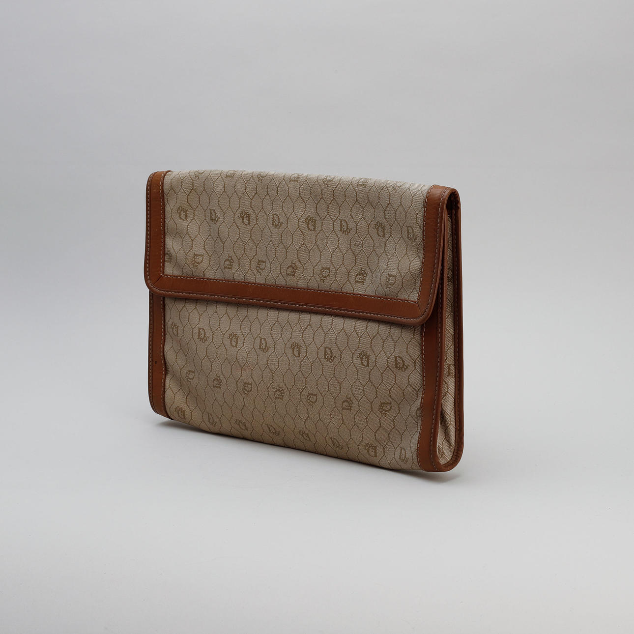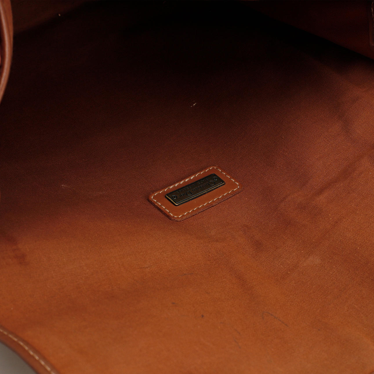 Coated canvas and leather details. One interior compartment, magnetic closure. Plaque marked. Dimensions approx. 28 x 36 cm.