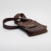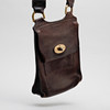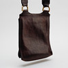 Brown leather with brass details. An outer compartment. Adjustable shoulder strap in canvas. About 19 x 25 x 5 cm.