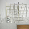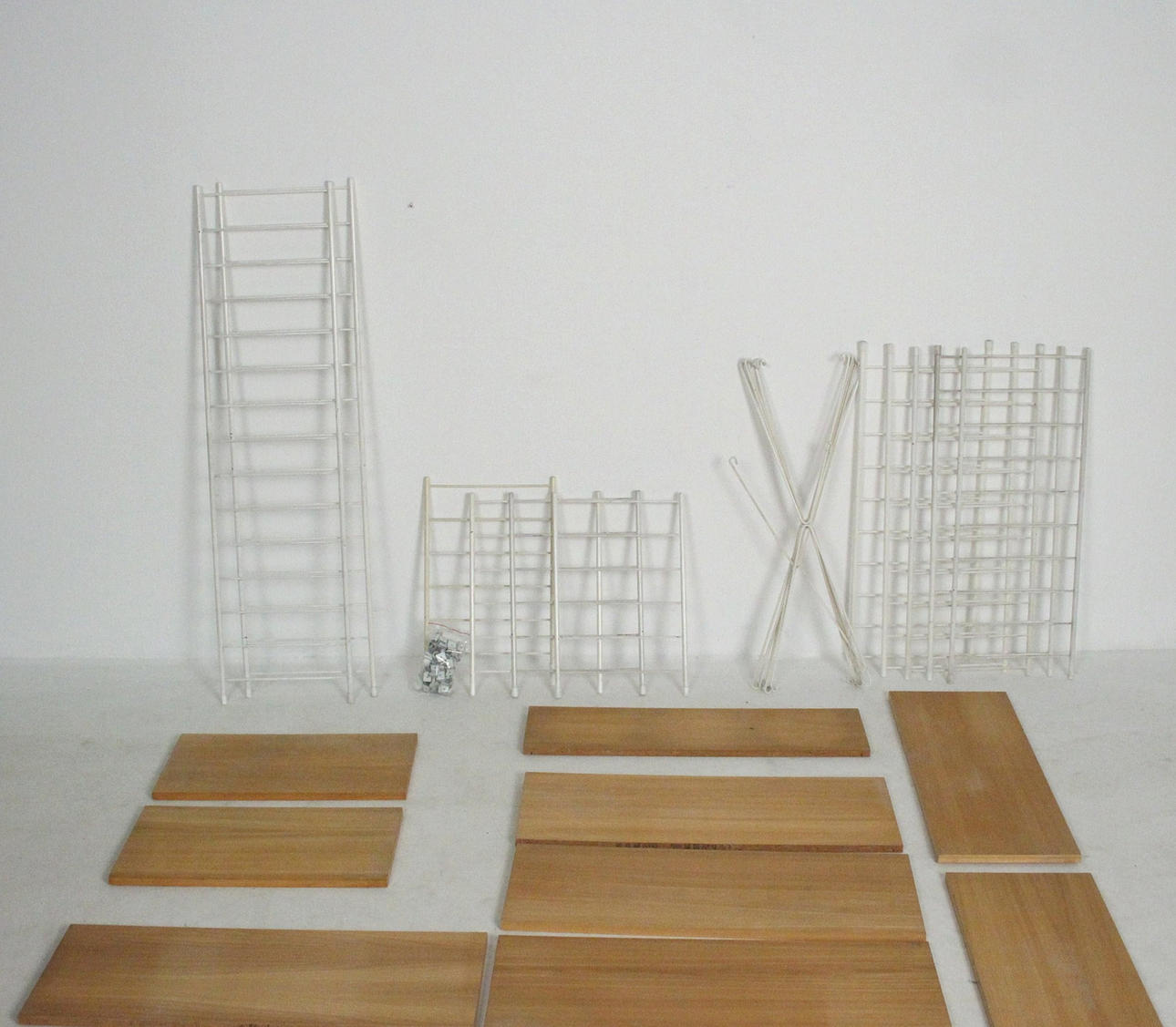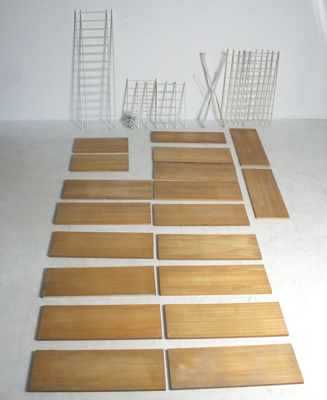 Material: light veneered wood, , white lacquered metal 16 shelves: H: 2 cm, W: 70 cm, D: 26 cm 1 shelf: H: 2 cm, W: 70 cm, D: 20 cm 2 shelves: H: 2 cm , W: 50 cm, D: 26 cm 4 side parts: H: 46 cm, W: 29 cm 4 side parts: H: 76 cm, W: 29 cm 2 side parts: H: 115 cm, W: 29 cm 5 connecting crosses: H : 74 cm 1 connecting cross: H: 58 cm.
