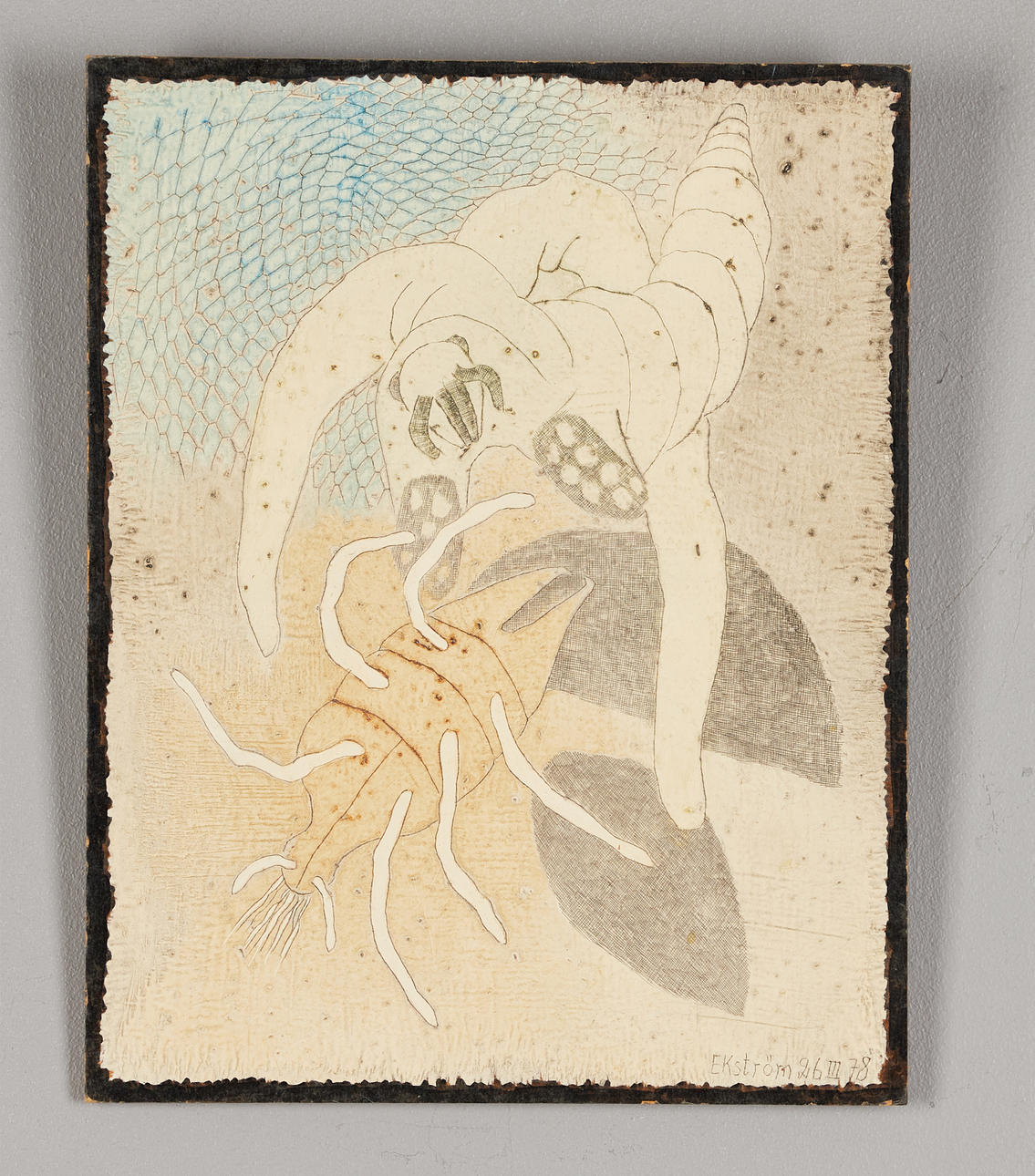 The paintings are carved and tattooed with their contents. On ordinary masonite, Ekström laid a lacquer primer and then carved with a needle the entire drawing in the form of small lines and dots. Thea Ekström is represented at the National Museum in Stockholm, Norrköping Art Museum and the Moderna Museet in Stockholm.