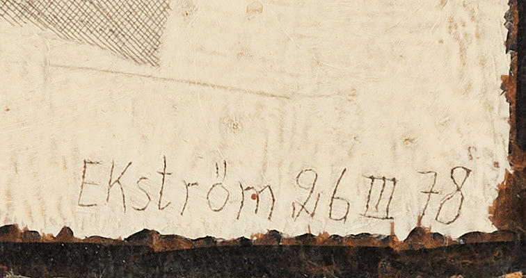Ekström created works inspired by Chinese ink paintings, Egyptian hieroglyphs and art movements such as surrealism and imaginism. Like rock carvings and magic drums, the pictures speak directly to us. The events in the works reflect the artist's many experiences and knowledge. She traveled with the Roma, could predict the swamp and "lay star", she studied music, was a bar pianist during the war, hid Jewish refugees, danced ballet and worked in circuses and amusement parks. The drama in her life was great where fear, anxiety and isolation are central and natural elements in her world of images.