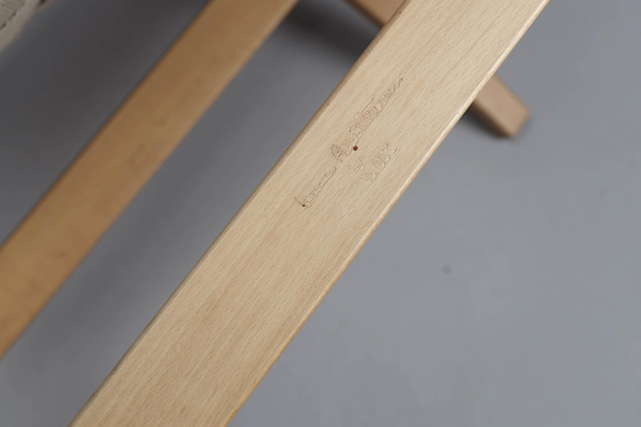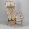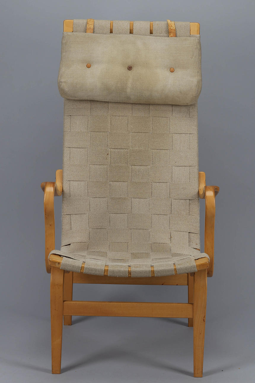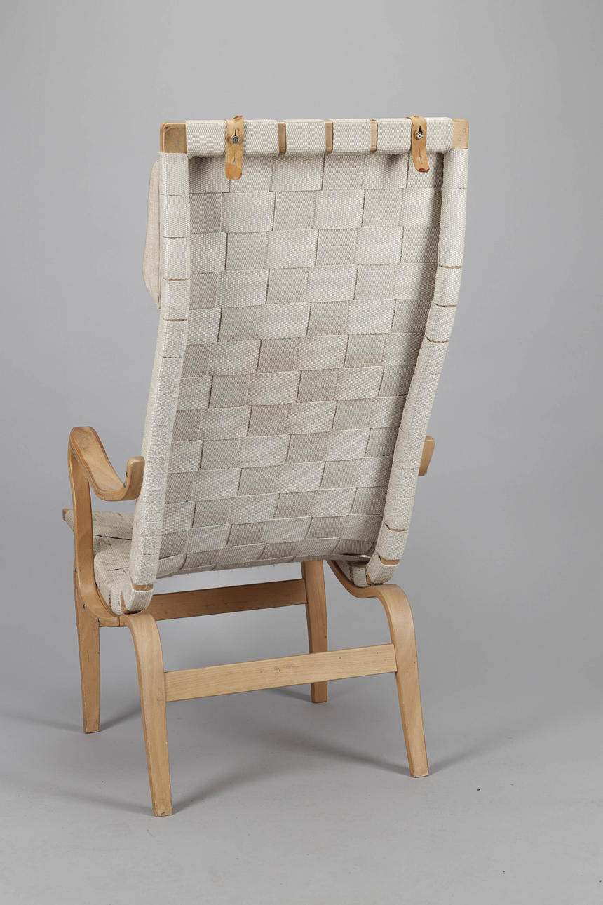 2249511. BRUNO MATHSSON. Armchair, "Eva" with high back, beech, saddle girth, Dux.