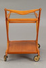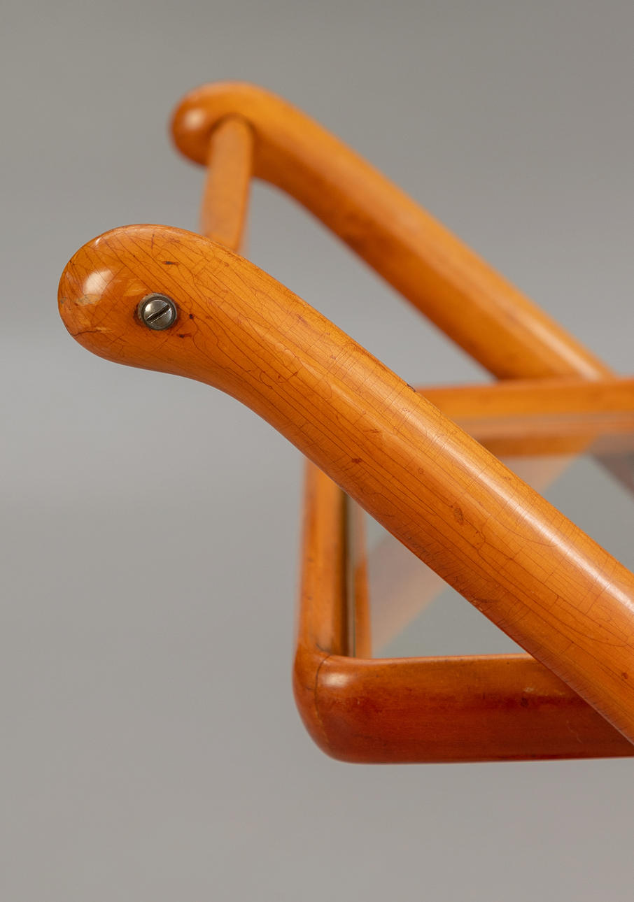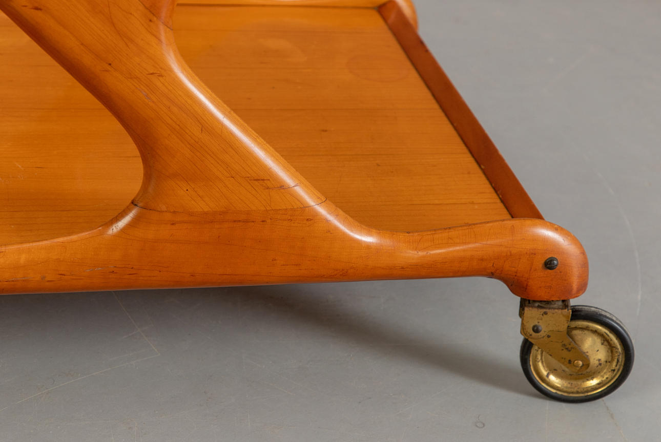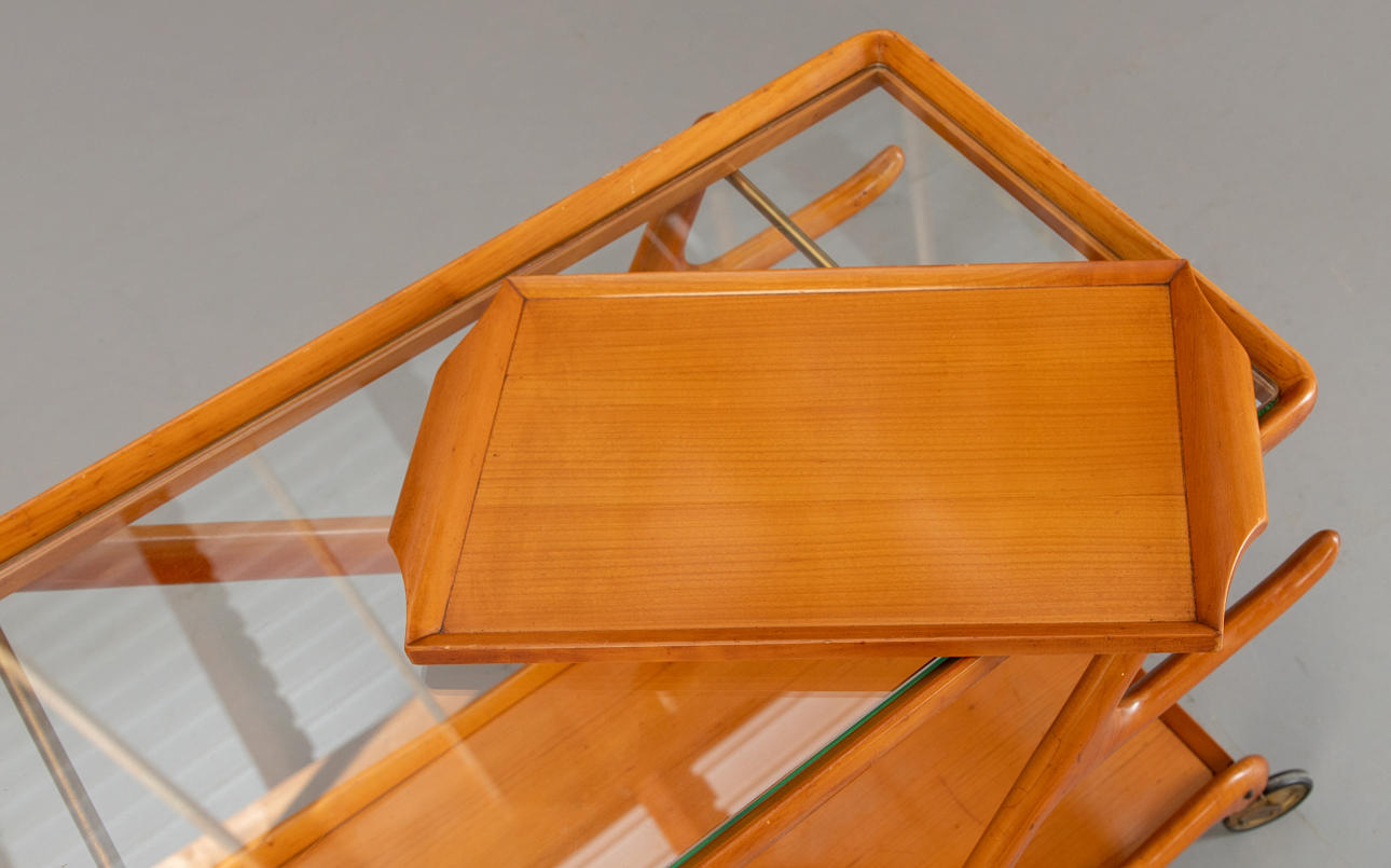 Serving trolley by Cesare Lacca for Cassina. Cherry wood frame and glass shelf. Comes with a loose wooden serving tray. Italian design, 1950s.