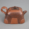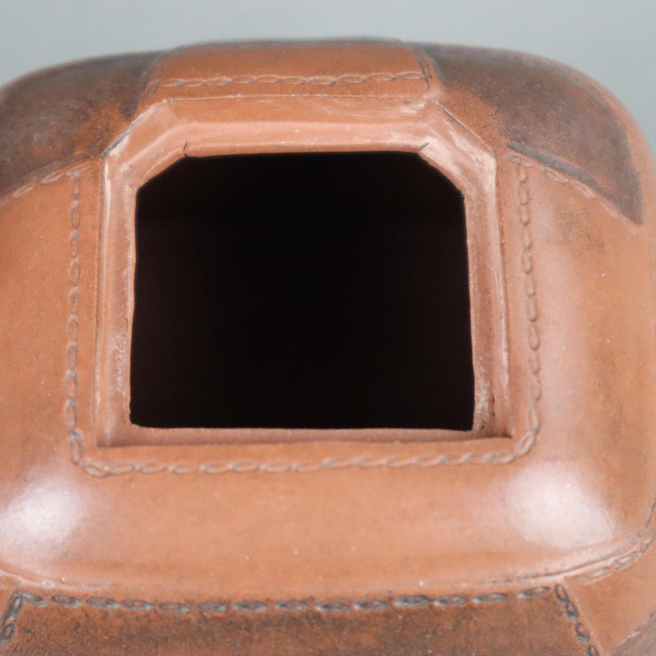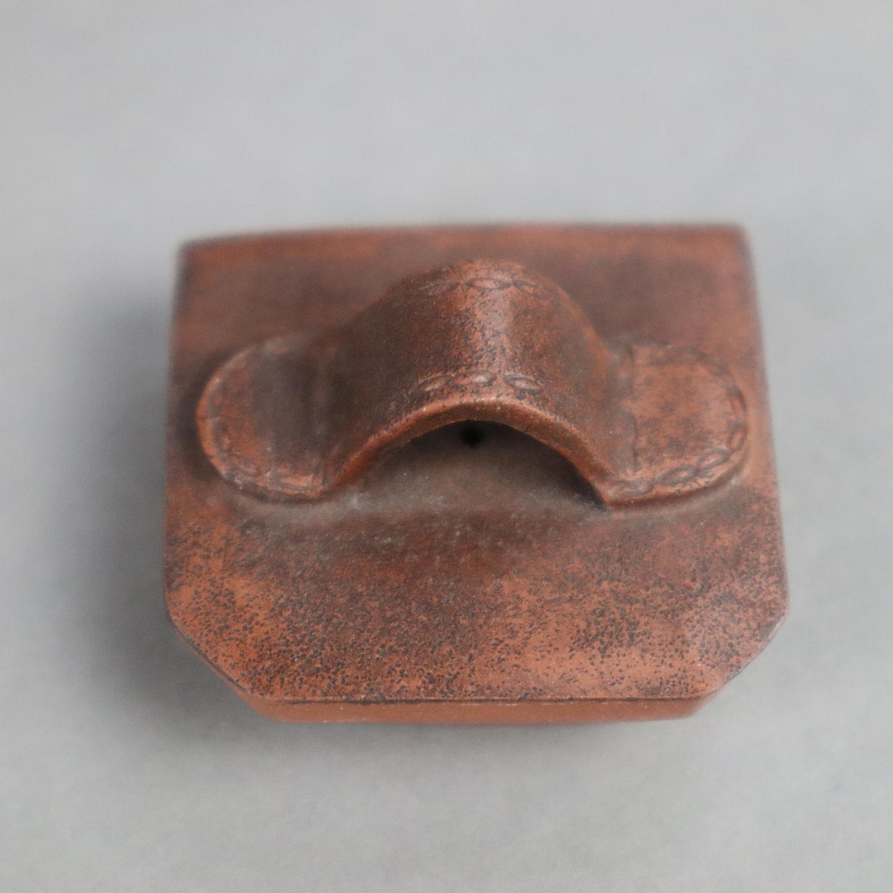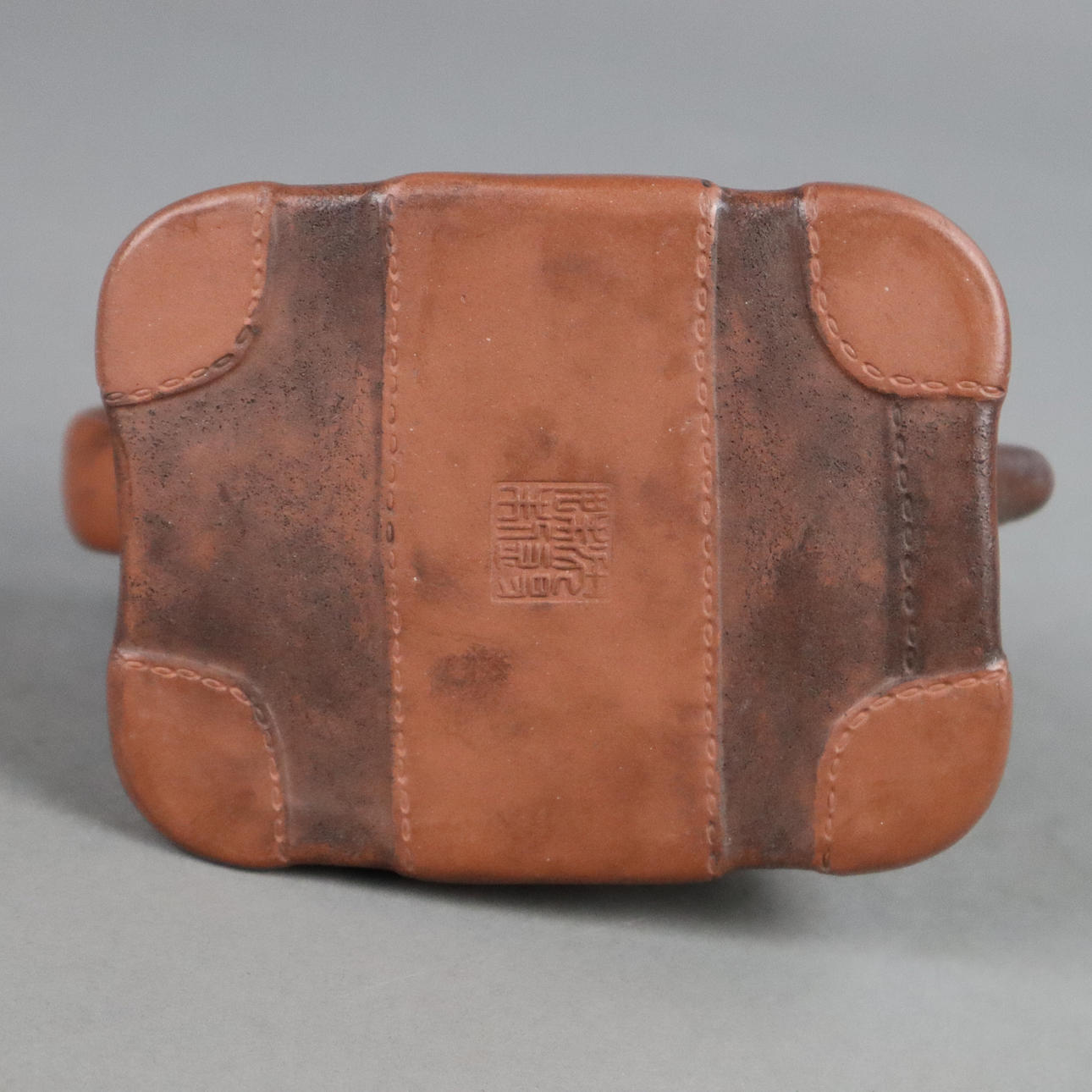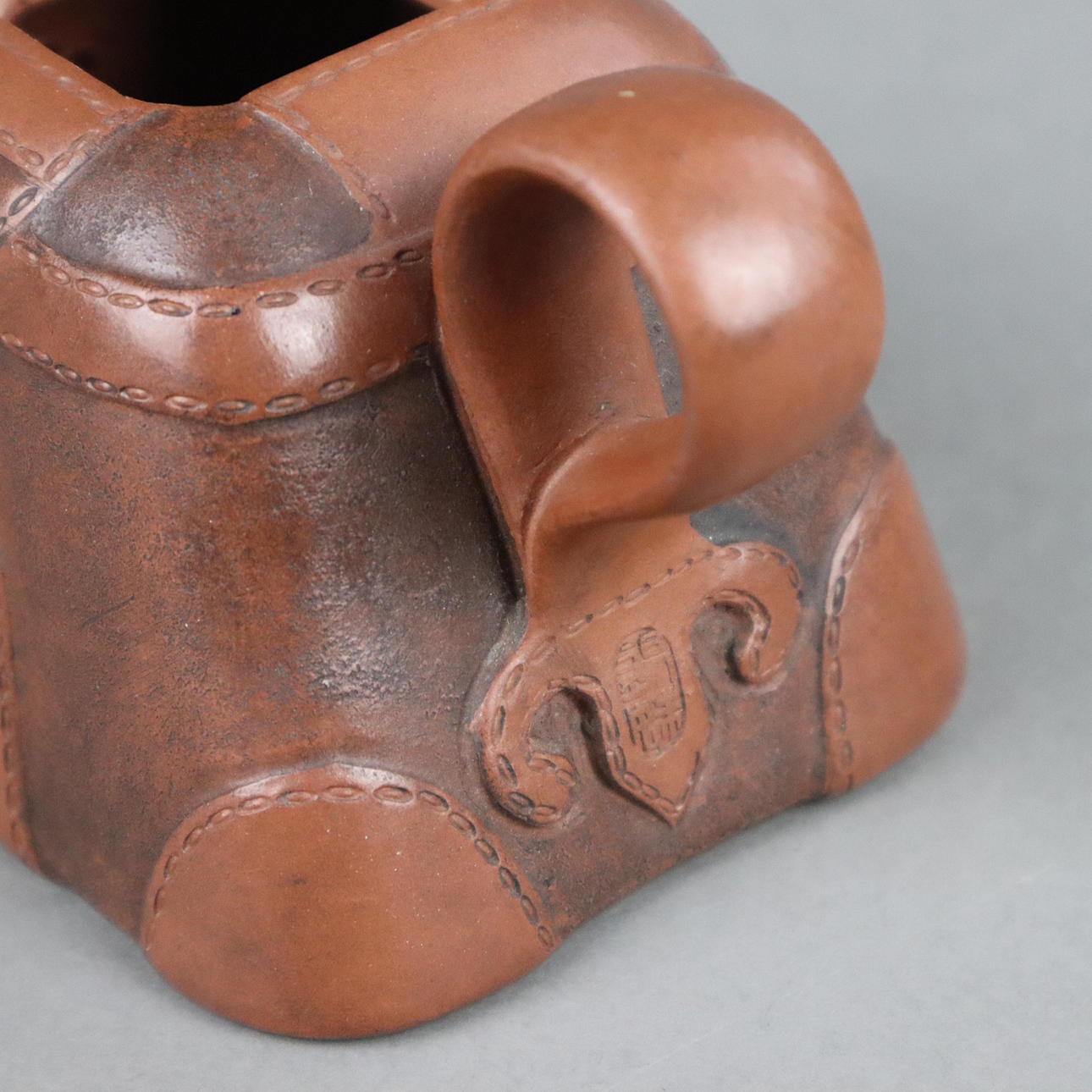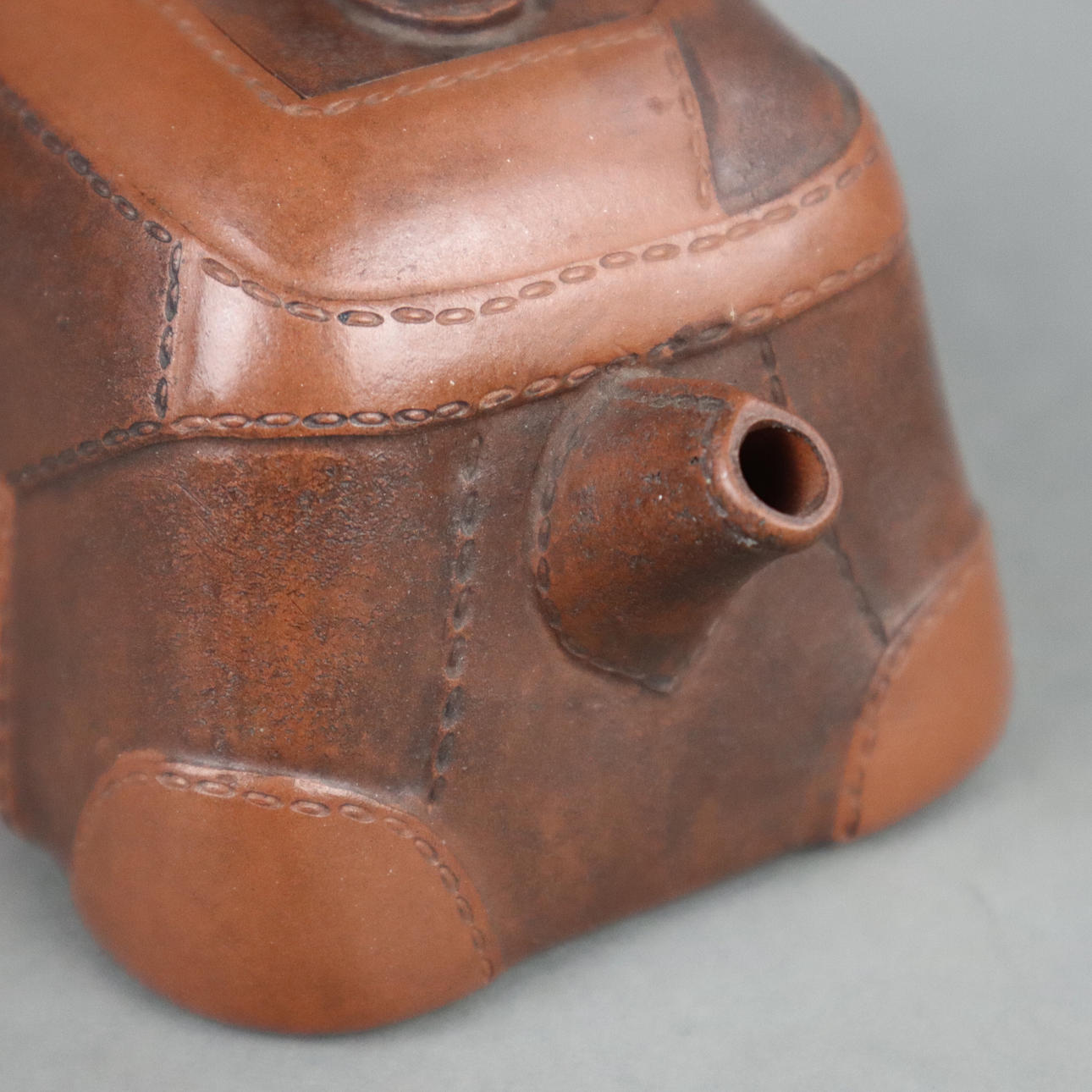 Jug with lid finely shaped in the shape of a handbag, floor mark and two seal marks pressed into the lid, approx. 7.1 x 12.2 x 8 cm.