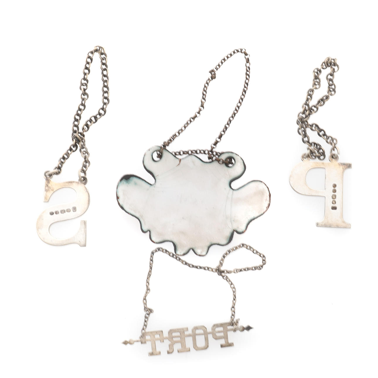 6cm across, a pair of electroplate initial wine labels, 'P' and 'S', foliate engraved, and an enamel cartouche shape label, 'RUM', painted with vines, flowers and leaf scrolls, 7cm wide (4).
