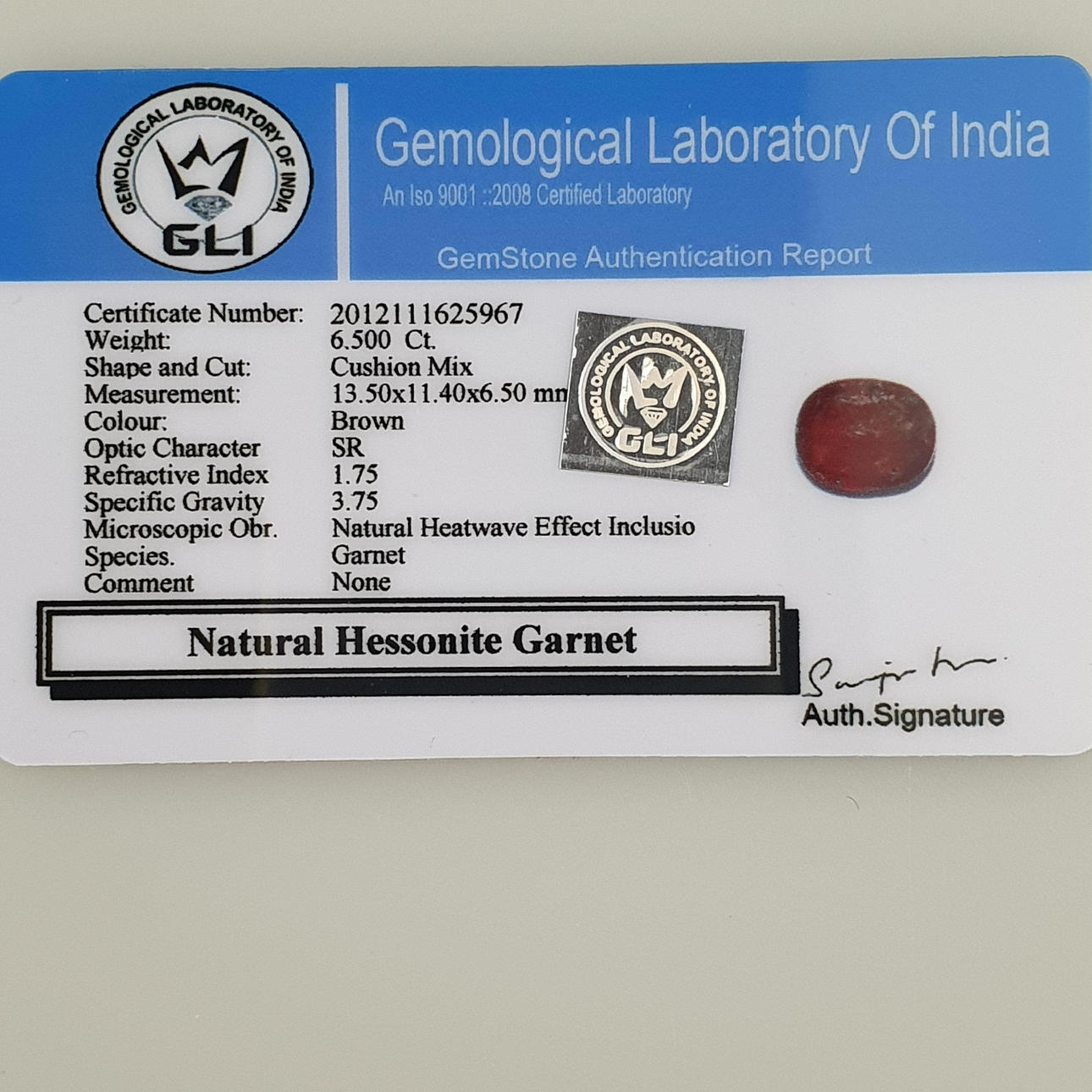 Loose Hessonite Garnet Gemstone, 6.5ct, with certificate.